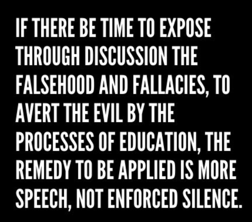 Justice Louis Brandeis remarked: "If there be time to expose through discussion the falsehood and fallacies, to avert the evil by the processes of education, the remedy to be applied is more speech, not enforced silence.”