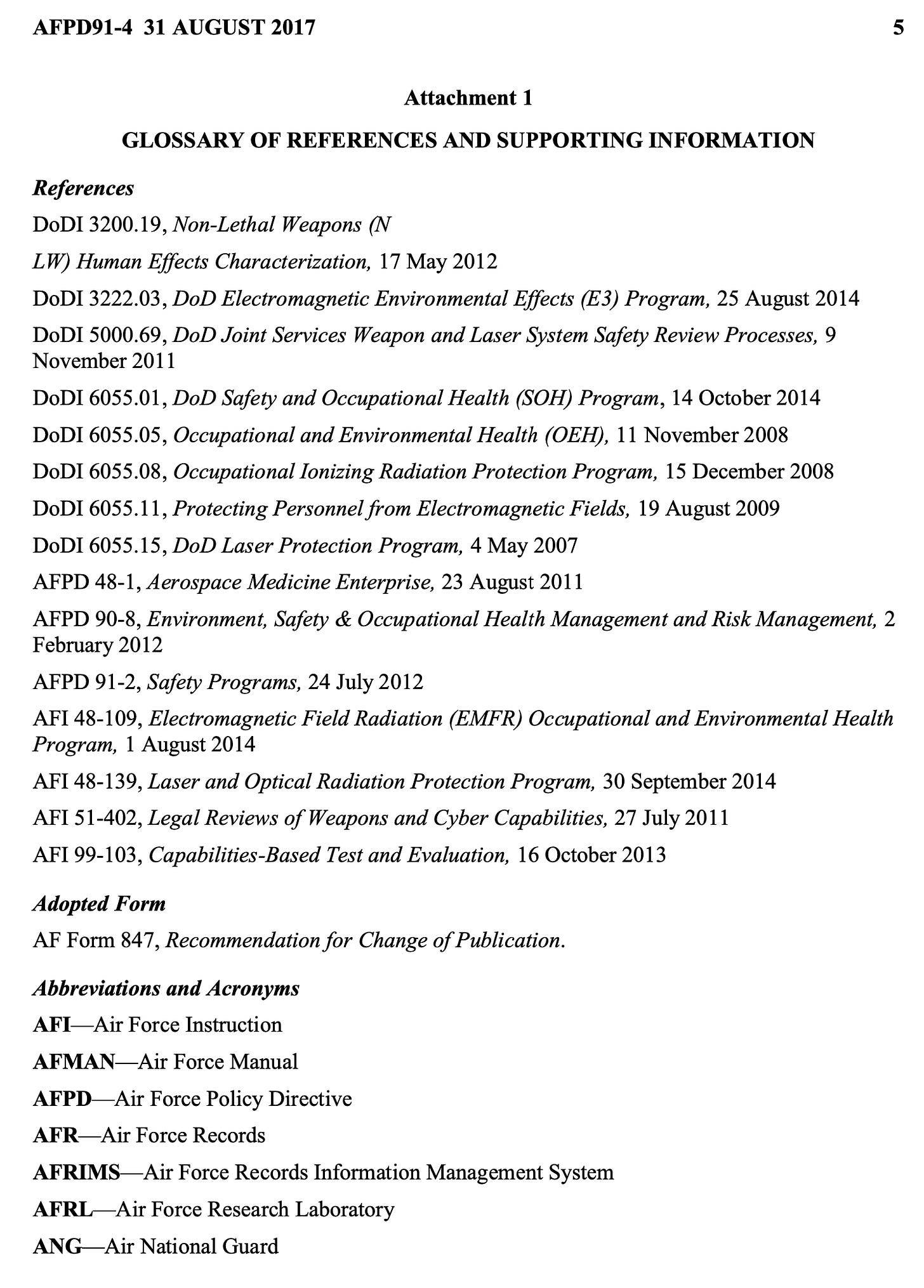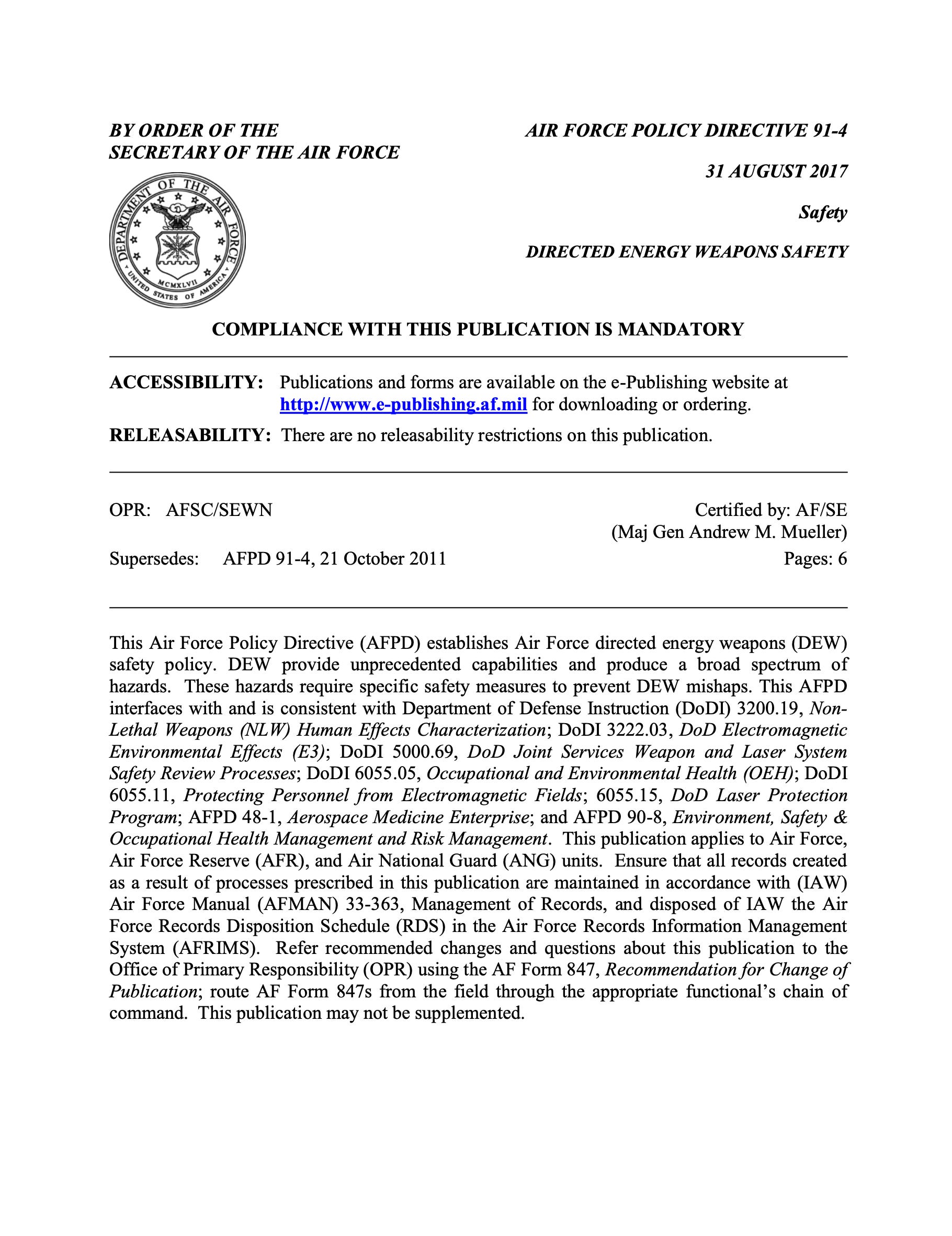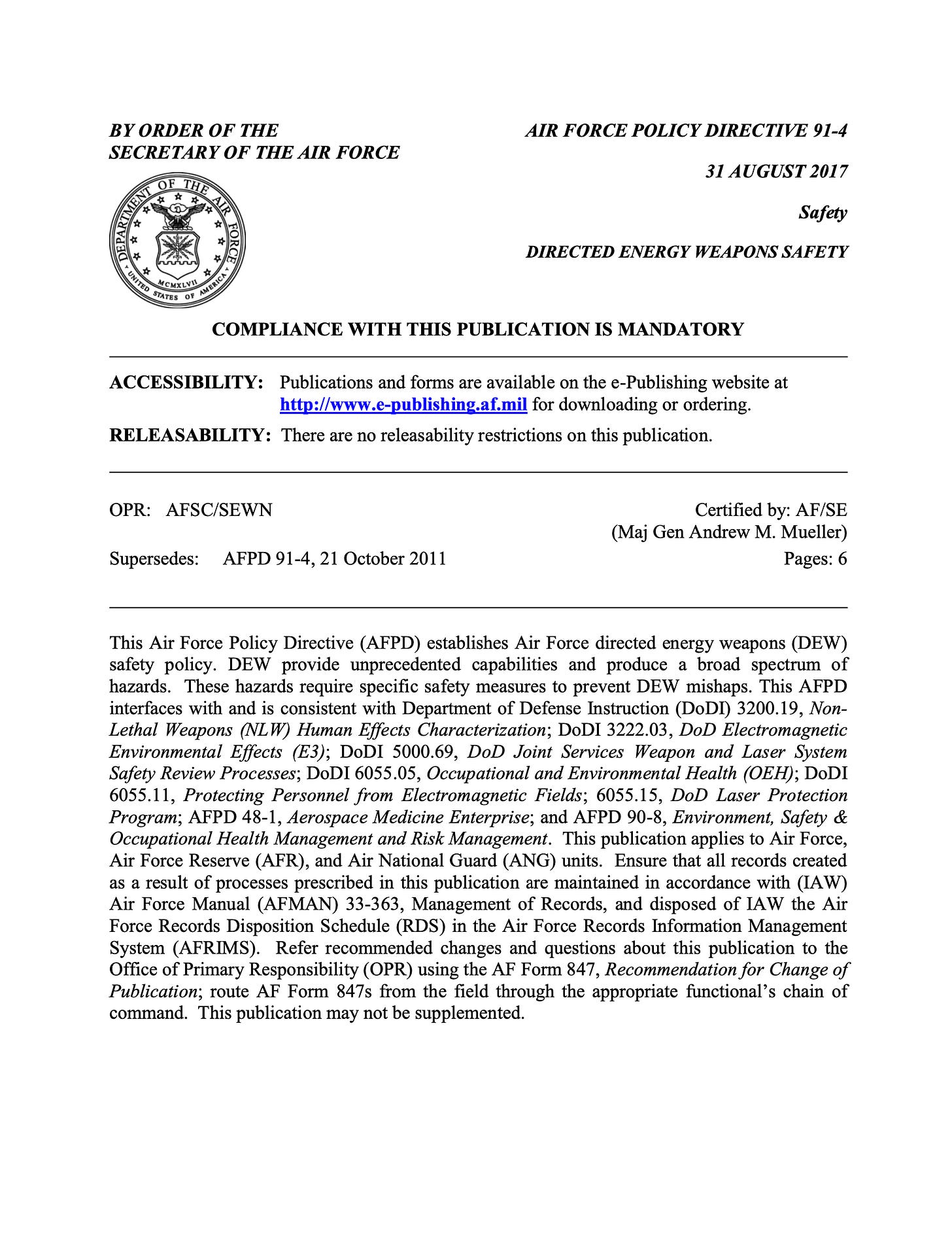 Redmond, W. (2008). Directed Energy Weapons Safety. Air Force Instruction 91-401. Department of the Air Force.