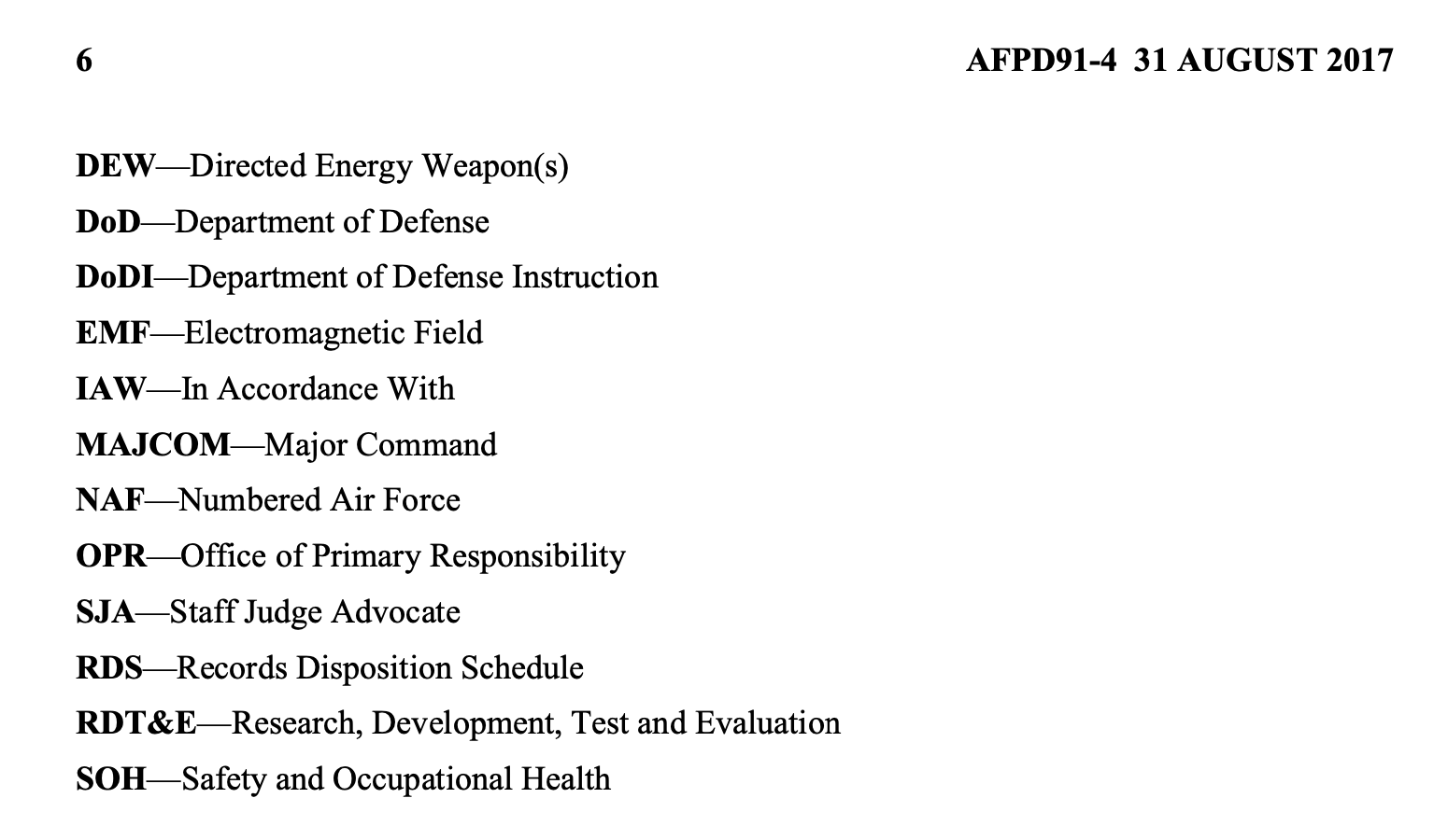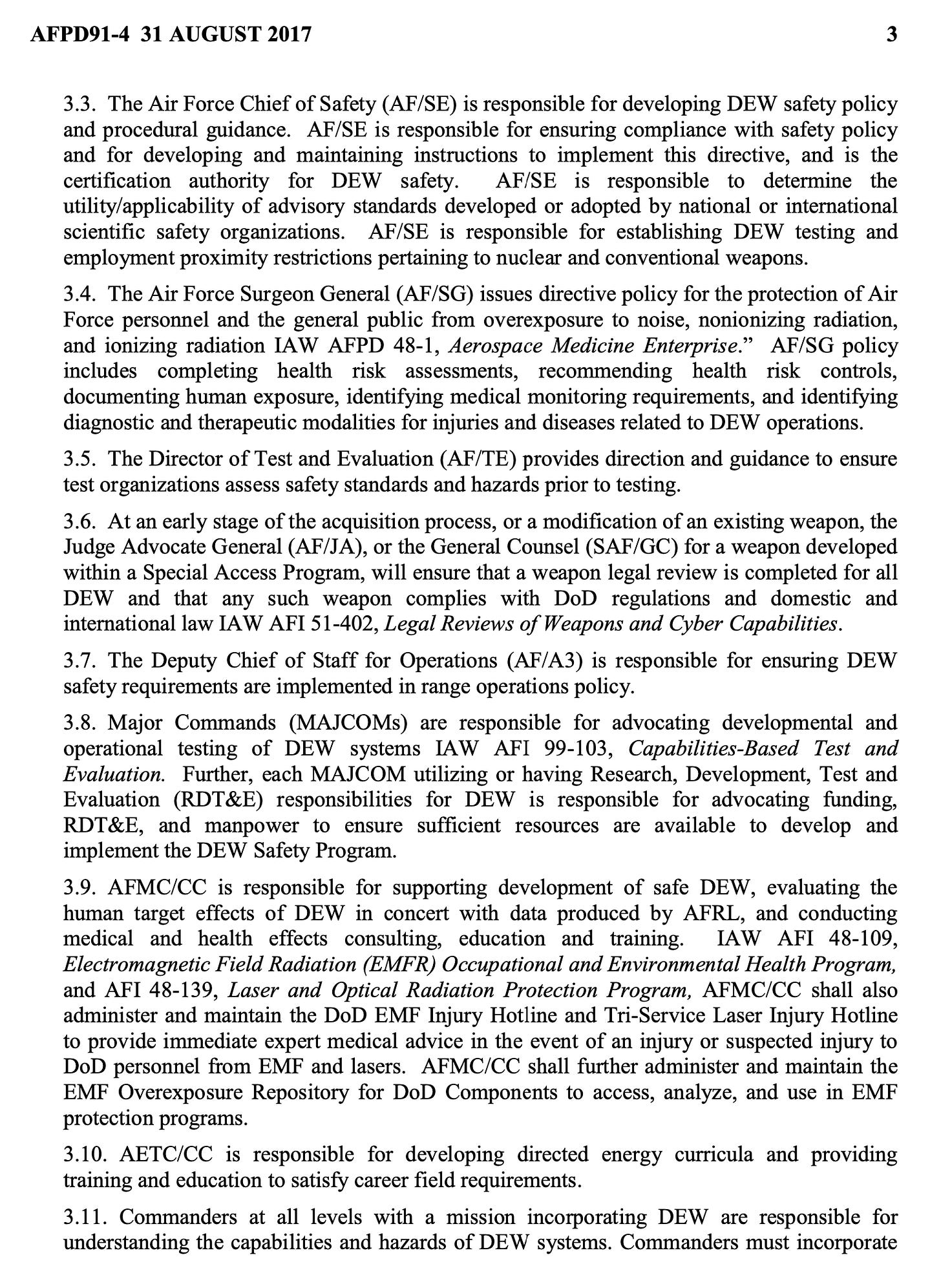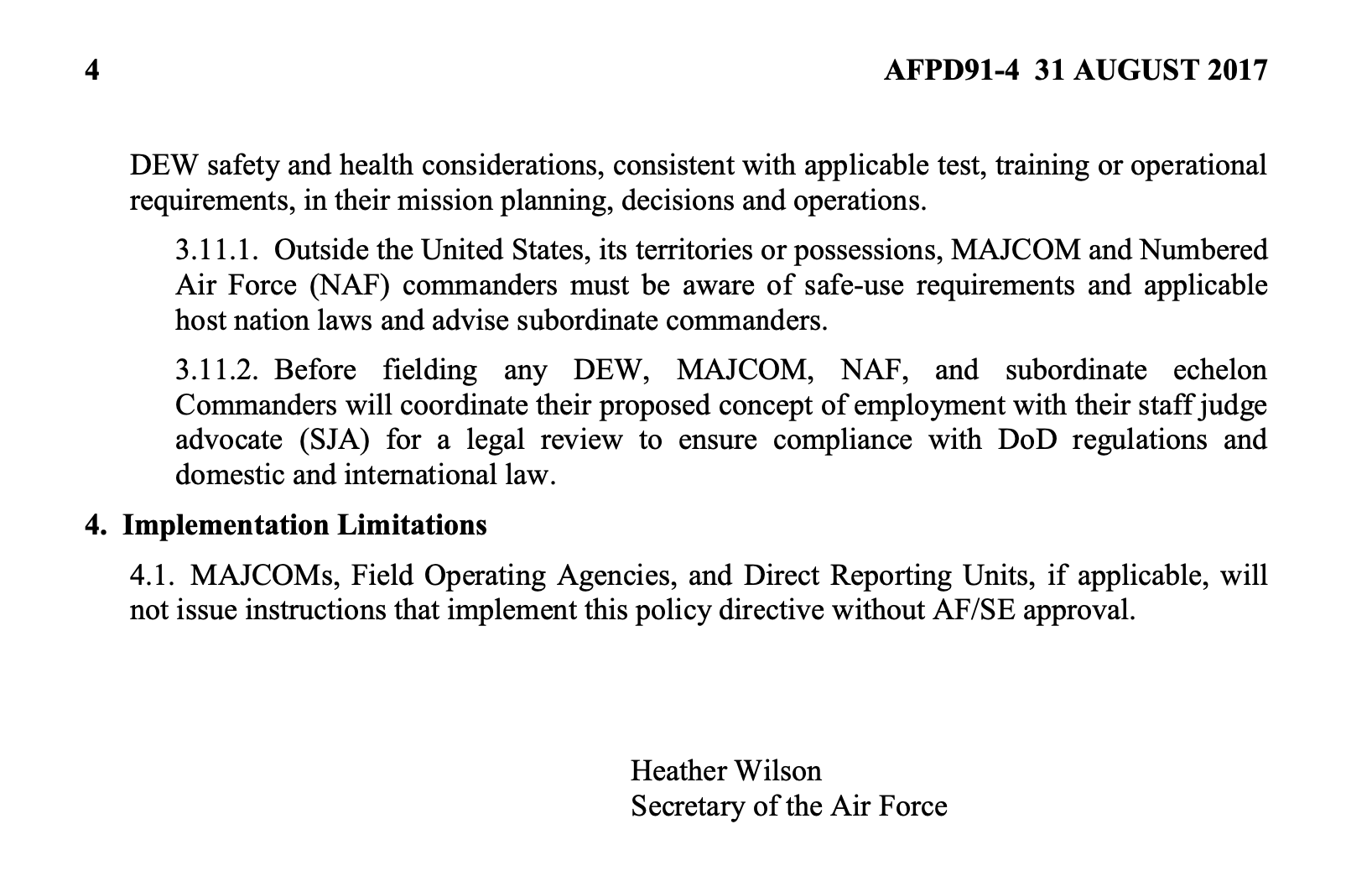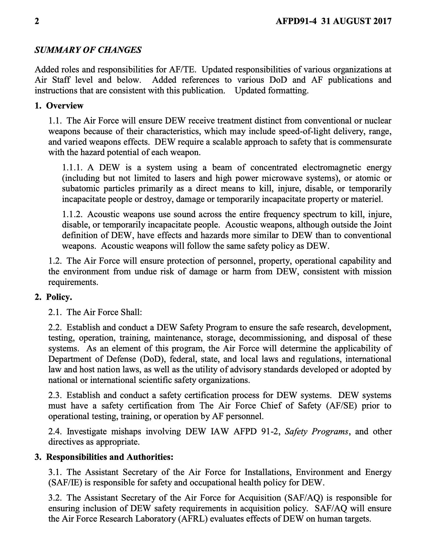 Redmond, W. (2008). Directed Energy Weapons Safety. Air Force Instruction 91-401. Department of the Air Force.