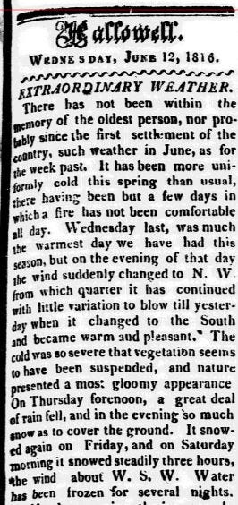 On the other side of the globe in New England, six inches of snow fell in June, and every month of that year had a hard frost.