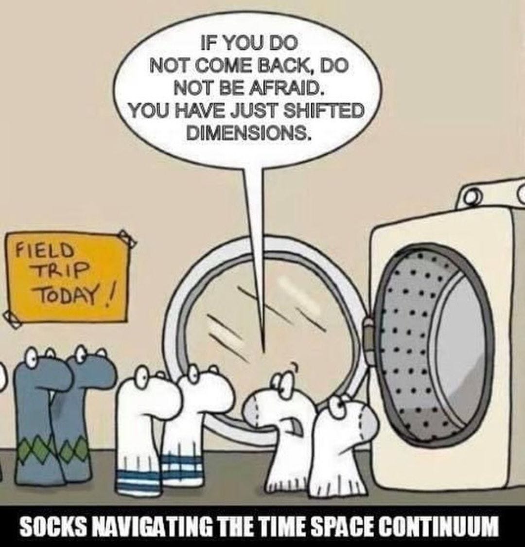 This was sheer goodness! The sock field trip through the space time continuum made me lose it. I had a story about orphan socks that I told my kids that they went to different dimensions to ascend. They often came back to help other socks do the same. You could tell the ascended socks by their wild colors, patterns and superior fiber content, as well as lack of synthetic fibers. So if you found 1 paisley sock made of cashmere in a fuchsia pallet you just knew it made it back to help.