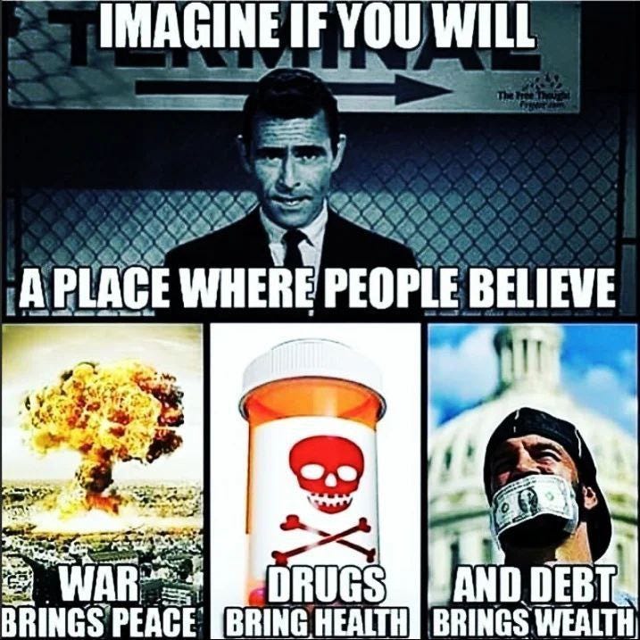 MEME DROP #122: Imagine If You Will A Place Where People Believe War Brings Peace, Drugs Bring Health, and Debt Brings Wealth