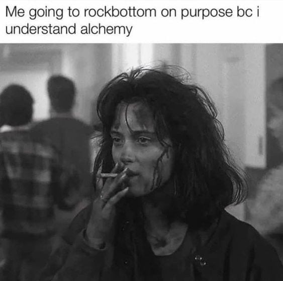 Ahhhhhhh, sweet fucked-up-ery memes this morning. I especially love the rock bottom alchemy 😂
