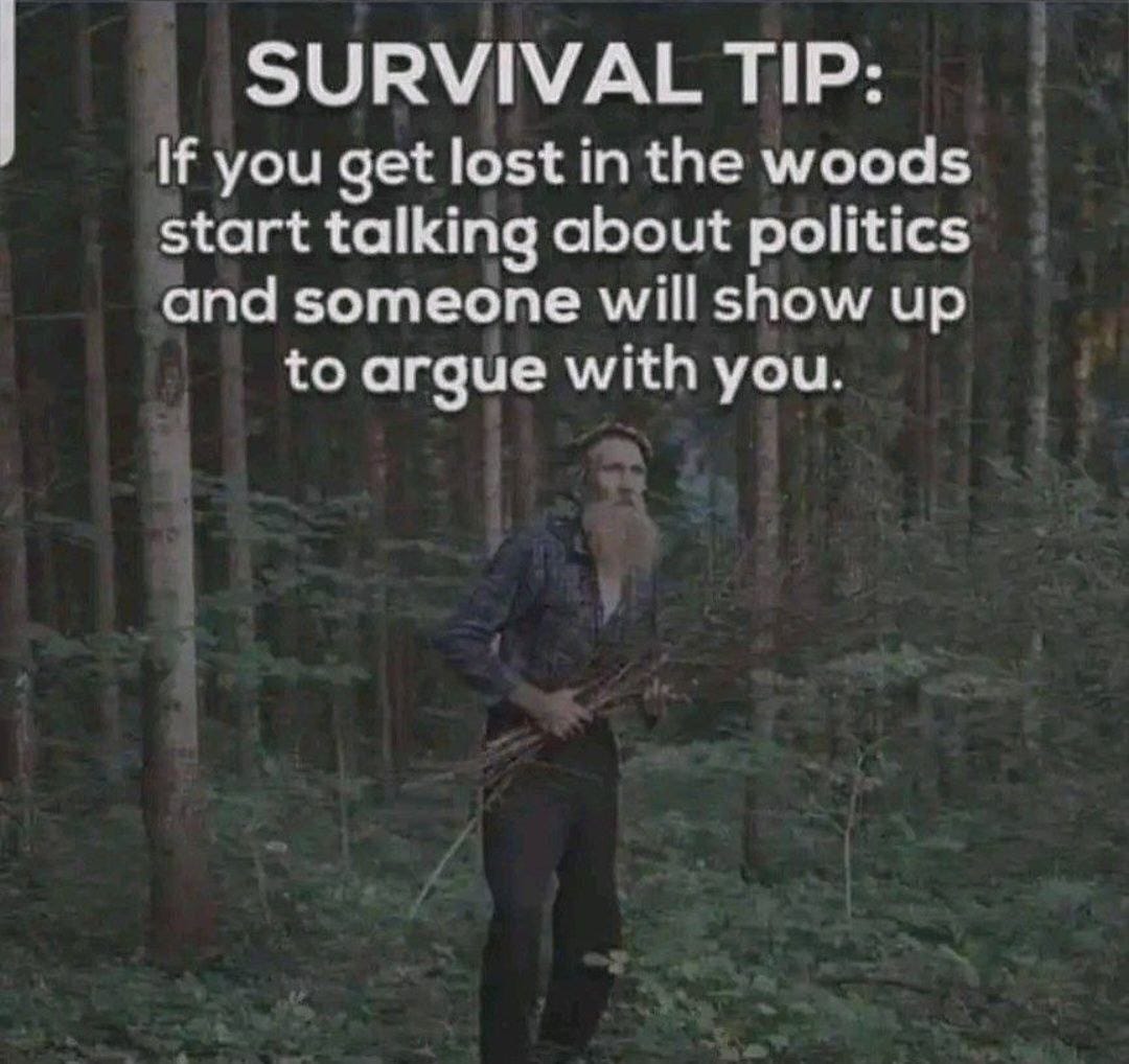 MEME DROP #146: SURVIVAL TIP: If You Get Lost In The Woods Start Talking About Politics And Someone Will Show Up To Argue With You