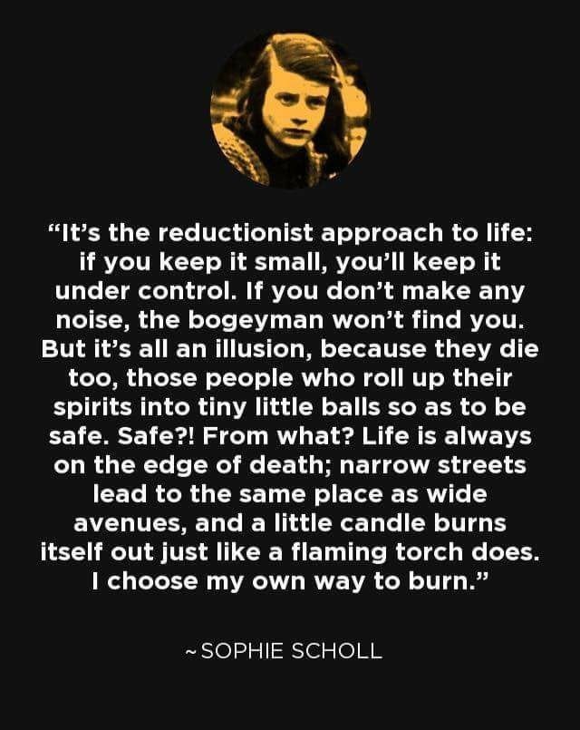 When you read up on Sophie Scholl and the White Rose you get a sense of how she chose. When you learn how the German govt murdered her in 1943, you know what she meant.
