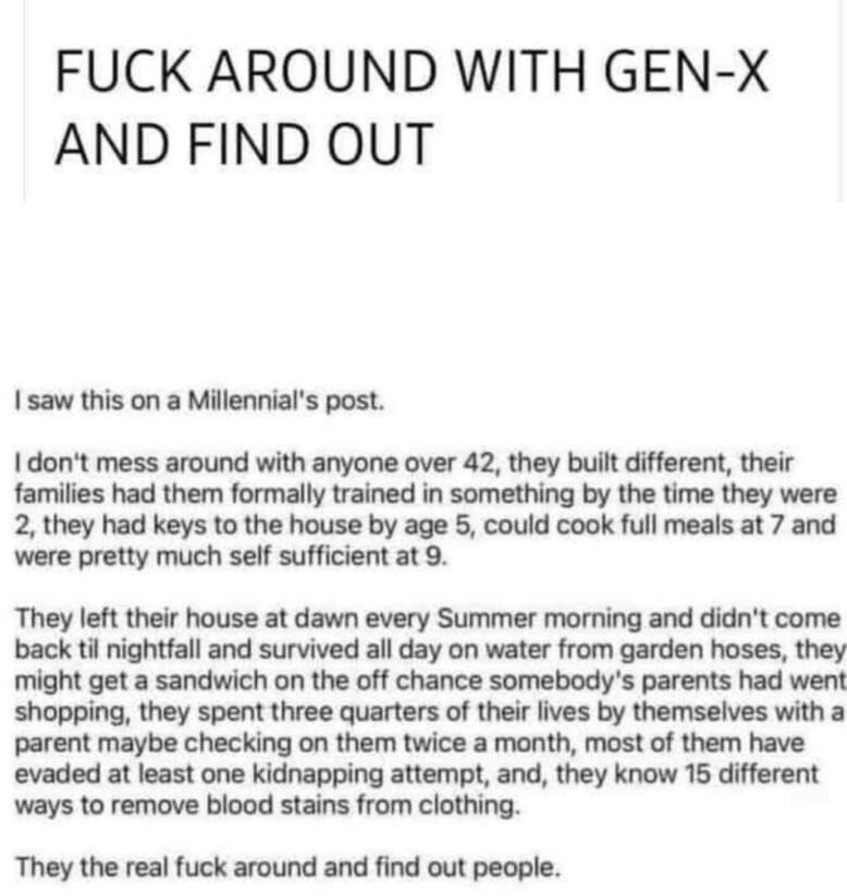 LOVE the one about Gen X--"cook a full meal at age 7," "10 ways to remove bloodstains." Definitely FAFO with your generation!