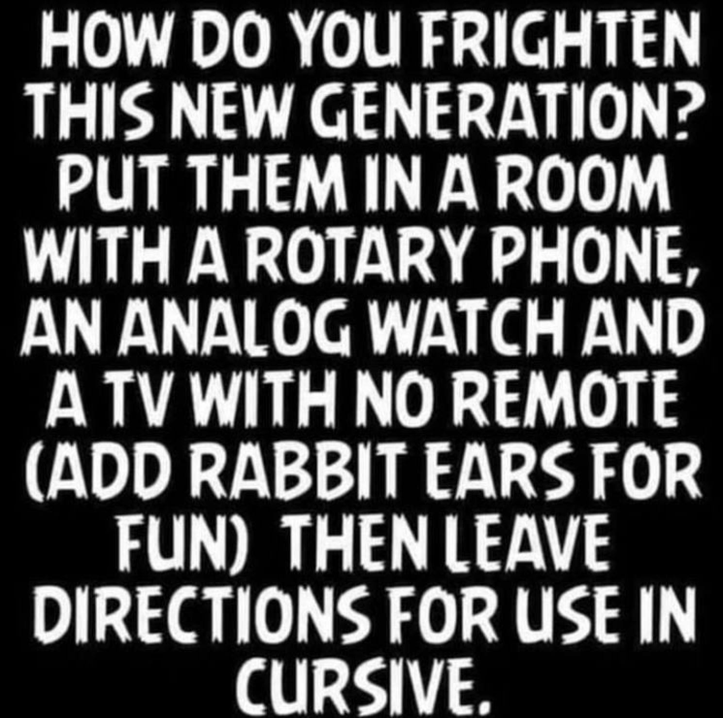 Put the younger generations in a room with a rotary phone and old TV without a remote control and rabbit ears for fun. 😂🤣😂