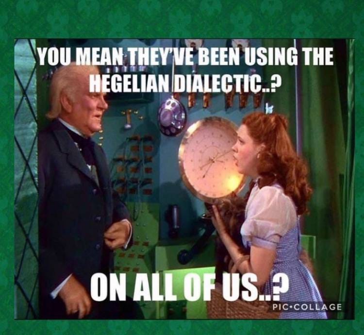 Please someone help me out with the Hegelian dialectic one. I have a surface-level understanding of the concept, but that's about it. How is this being used upon all of us? Fake crises (antithesis) + their fake solutions (synthesis)?