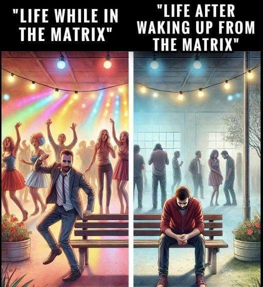 I’d reverse the matrix meme now. Early on waking up sucked hard in a bad way, but now it’s party time 😝