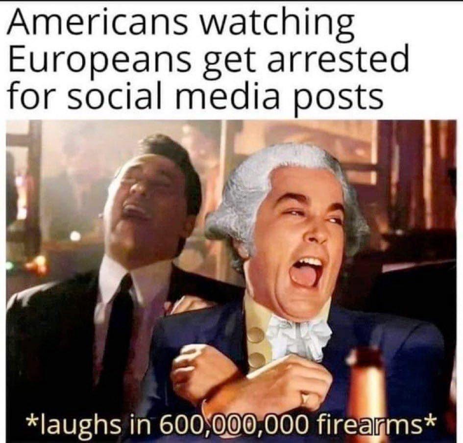 "Laughs in 600000 firearms" damn straight! I'm waiting for the people in the UK to realize they can't all be arrested and have mass meme postings.