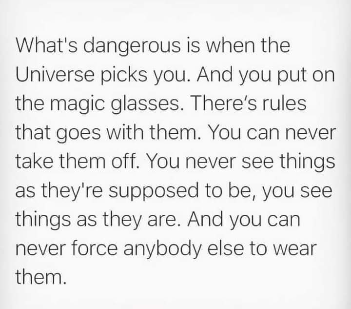 “The magic glasses”…..Holy crap, that hits home. It was a LOT easier when I did not have them. Word of caution, never pray to see the truth of the world, which is what I did in 2013. Holy crap!!!!