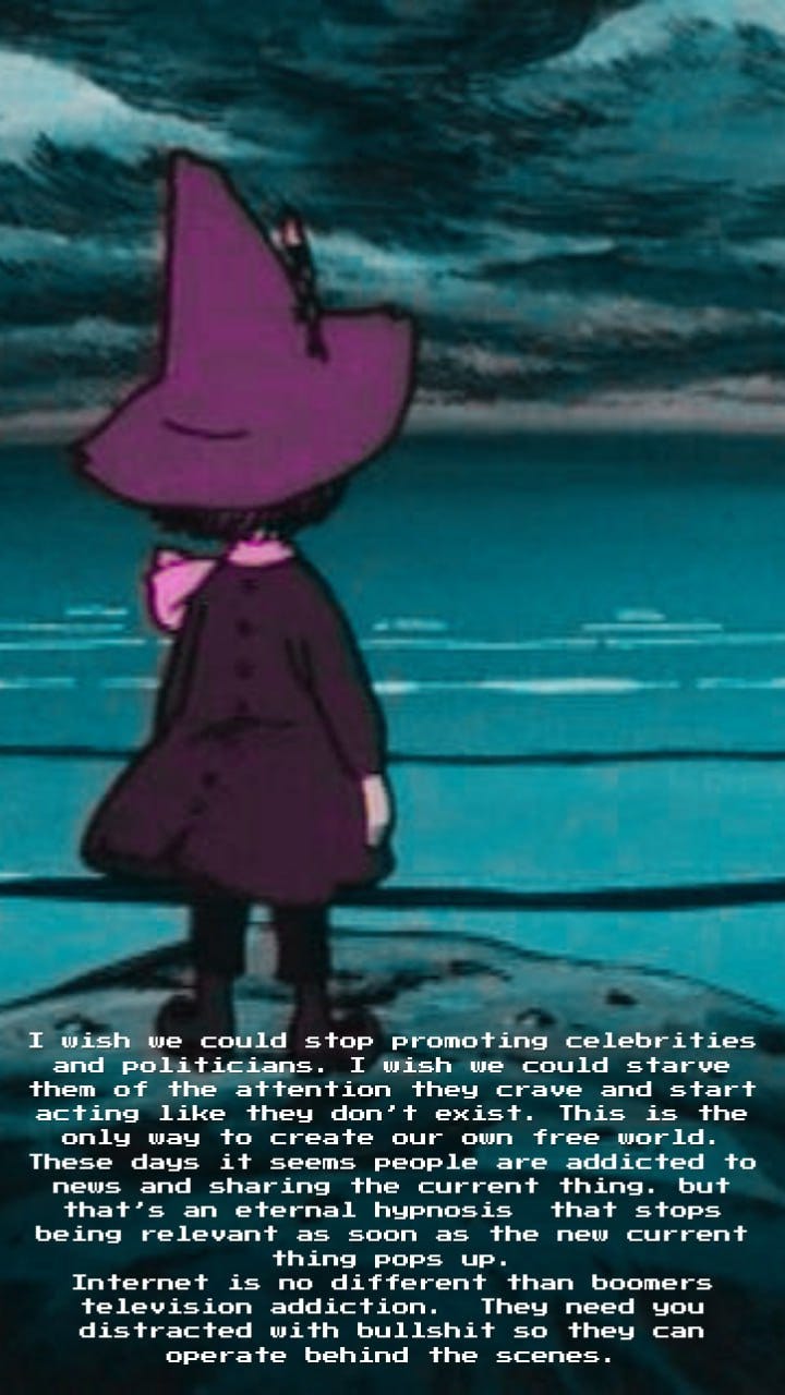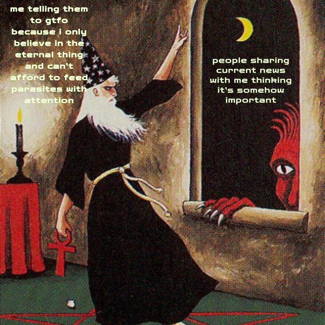 MEME DROP #59: People Sharing Current News With Me Thinking It’s Somehow Important. Me Telling Them To GTFO Because I Believe In The Eternal Thing And Can’t Afford To Feed Parasites With Attention.