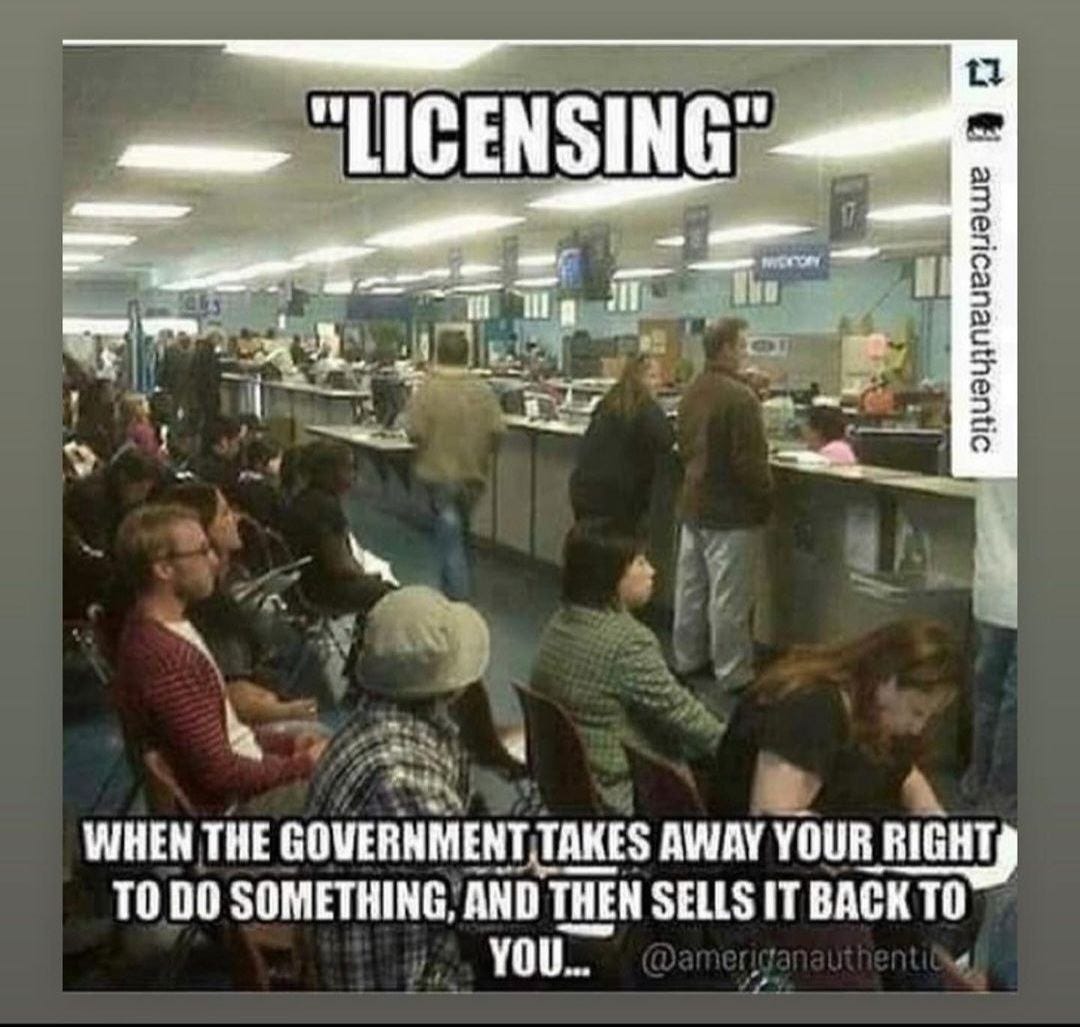 Licensing is when the government steals one of your rights and then RENTS it back to you....with strings attached.