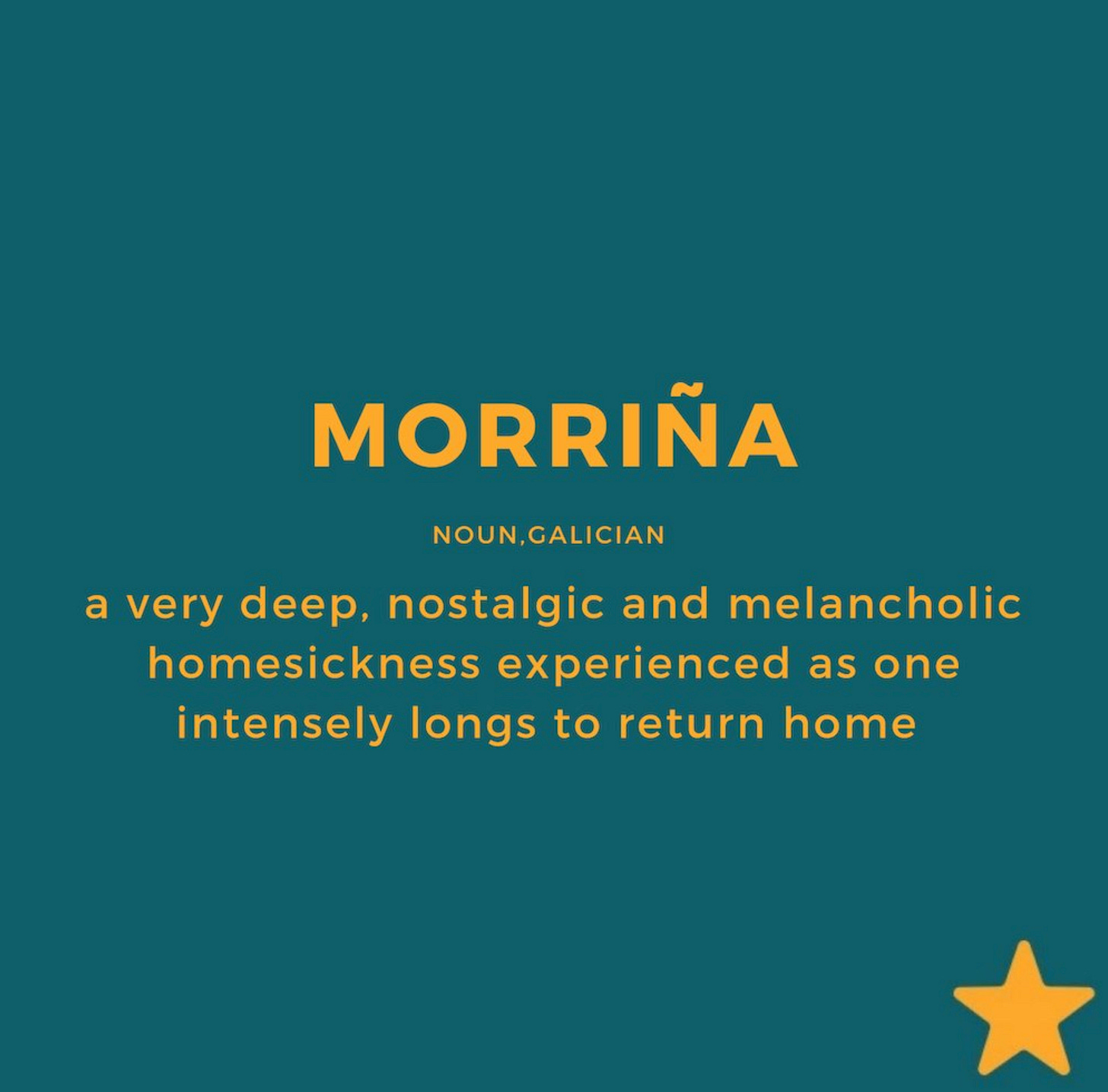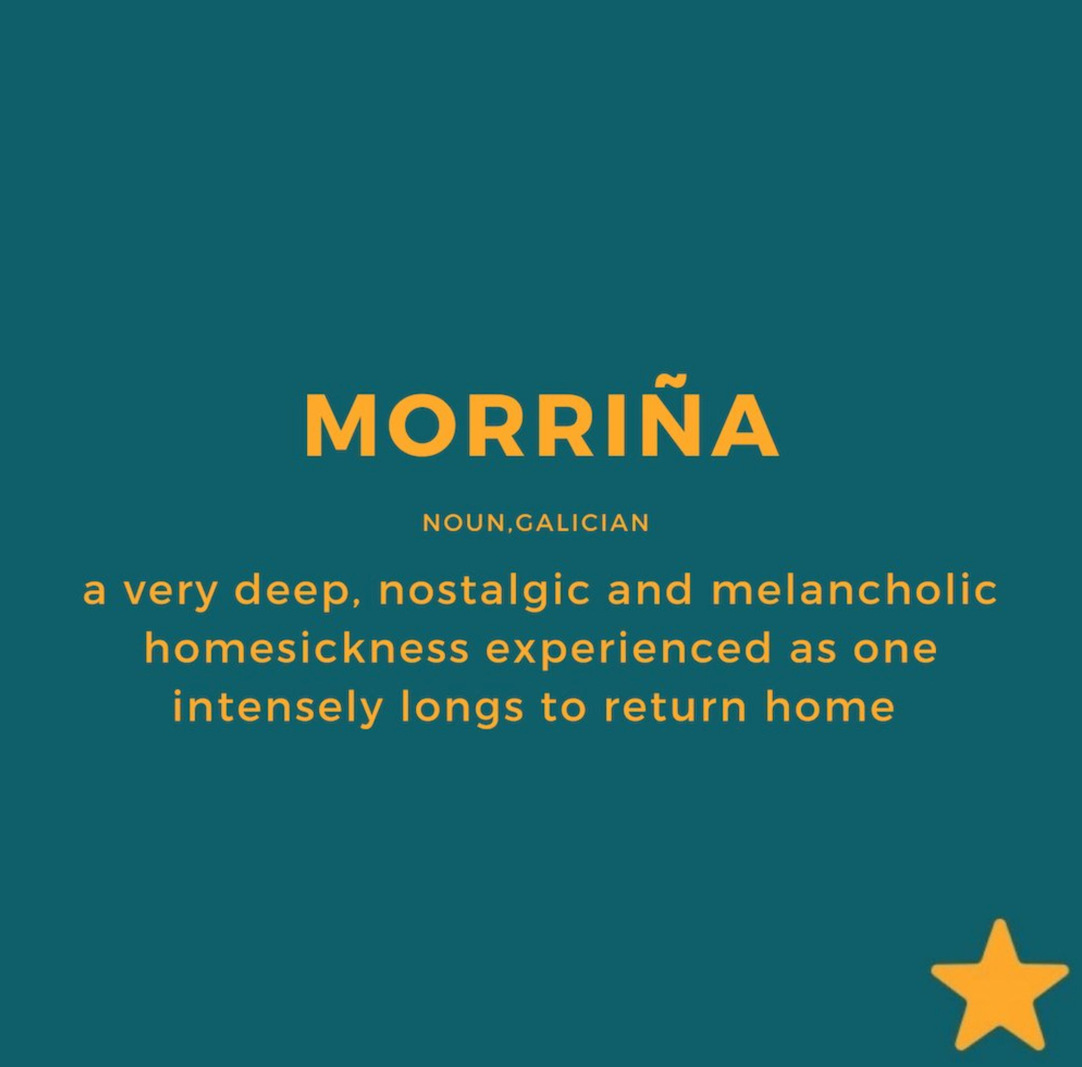 From morrinha (Galician-Portuguese), originally meaning anxiety or fear over time evolved into nostalgia or homesickness, this word has common etymological origins with saudade both geographically and emotionally. It evokes such shared melancholy in Galician-Portuguese culture – a yearning for bonds and familiarity, as well as comfort in the absent.