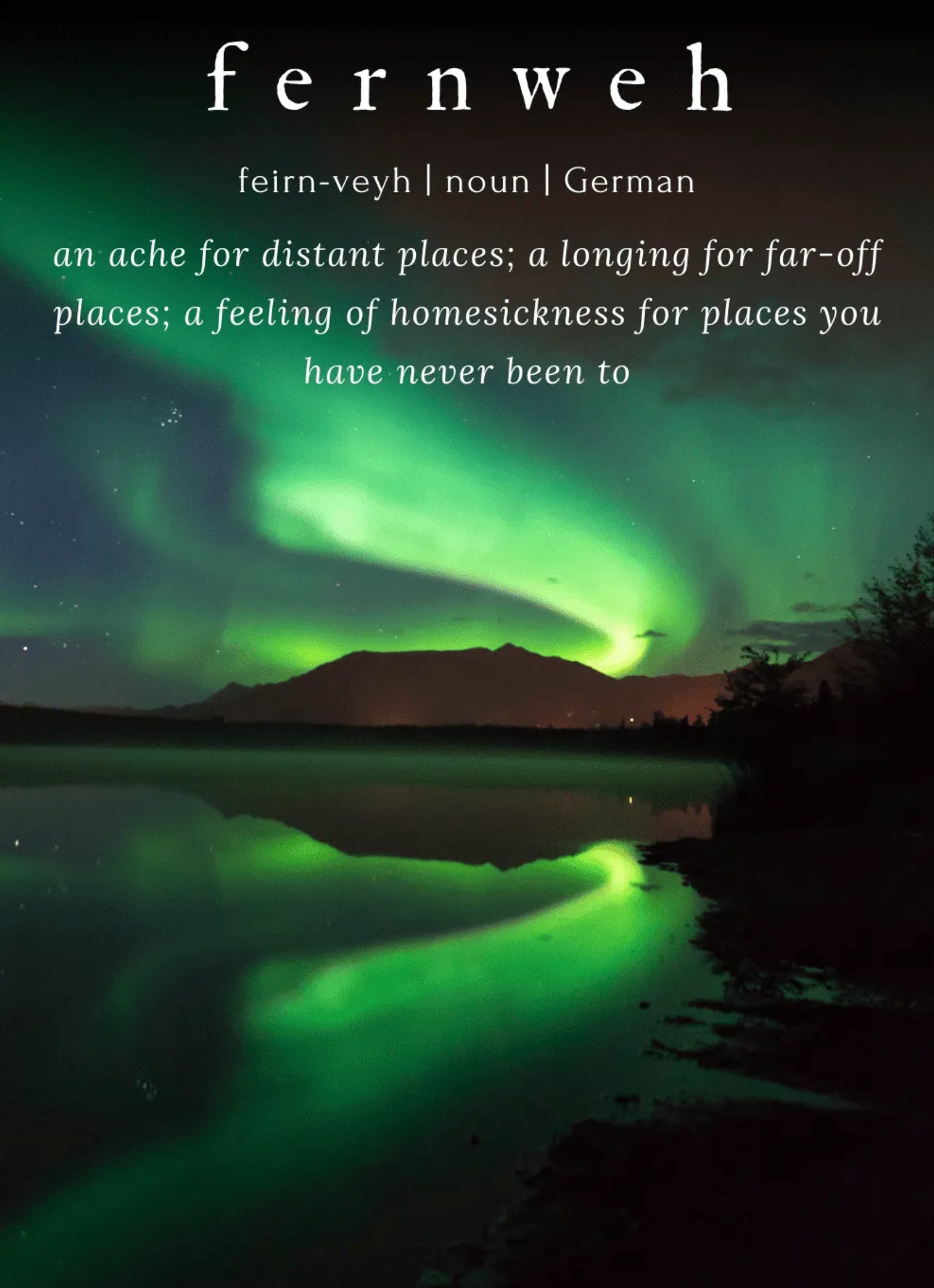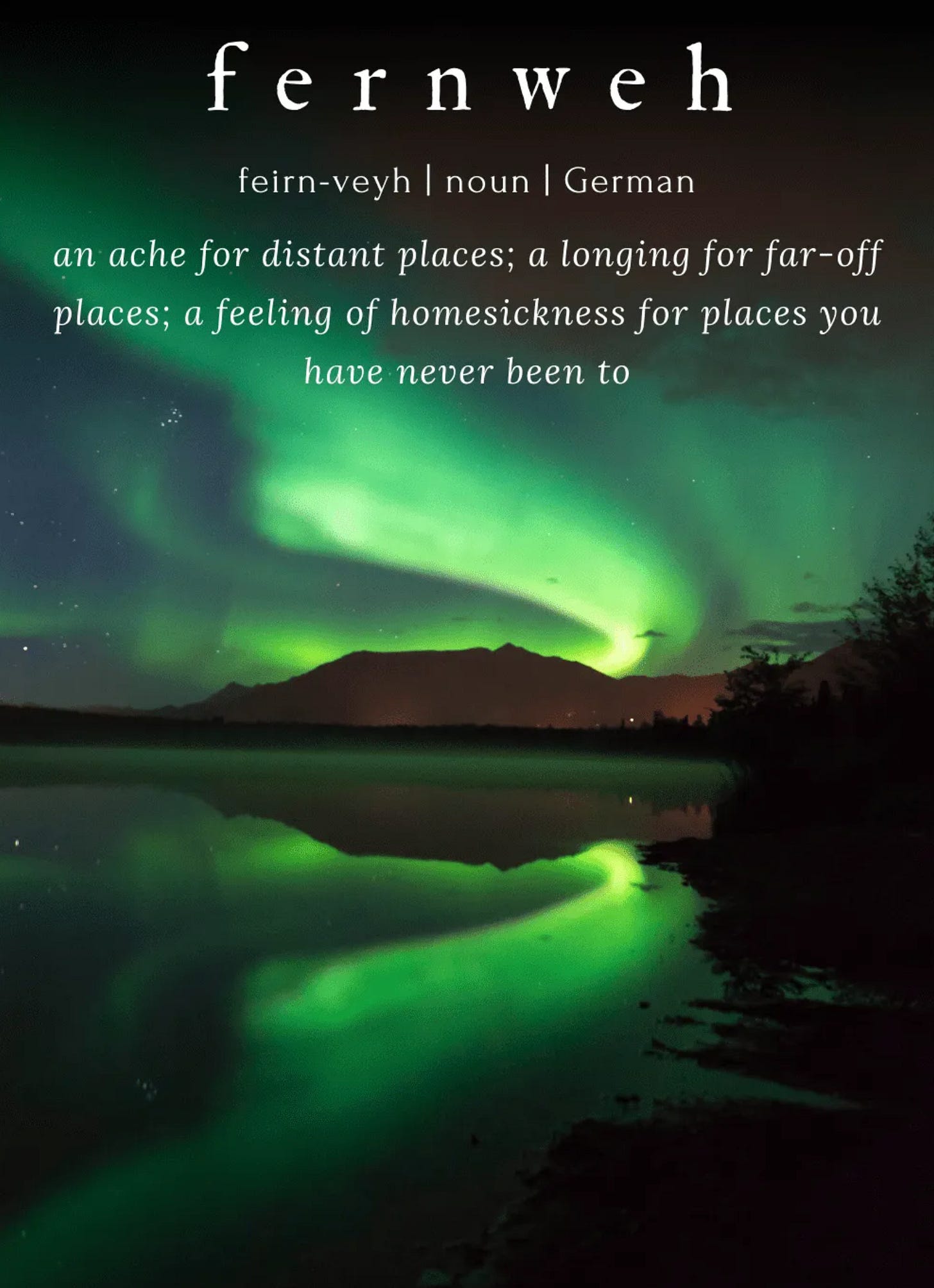Fernweh is a German word meaning a longing for far-off places. It expresses a wistful desire to travel and experience distant lands you have never seen. Unlike ‘wanderlust’, which connotes an urge to wander, fernweh is more passive. It is the bittersweet longing for places you may never reach, rather than the drive to actually venture forth. Fernweh evokes the German cultural preoccupation with lands afar. It captures a melancholic desire to escape and discover new horizons beyond one's reach. There is a saudade-like sadness underlying this longing for distant geographies.