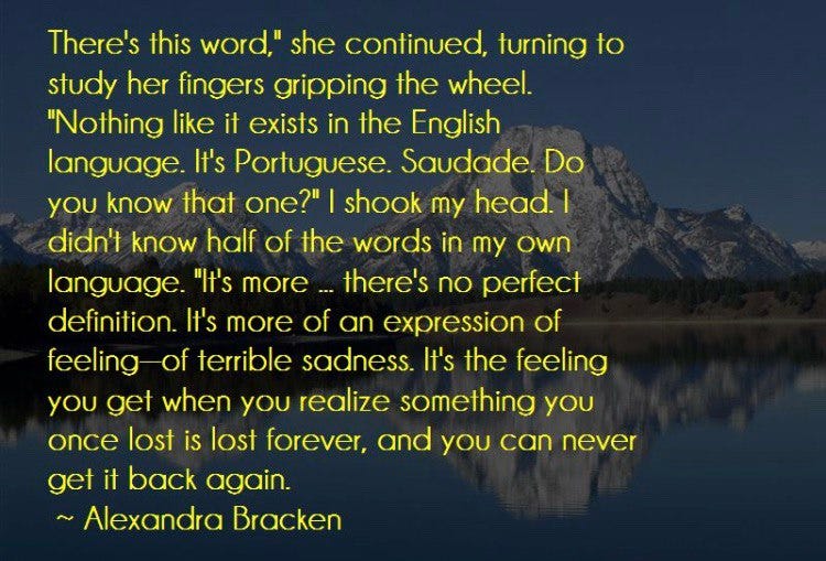[NOTE: Inspired by our recent exploration of grief, as well as a number of posts over the years regarding words which seem not to have any specific conceptual English equivalent, I decided to do an exploration of the Portuguese word saudade and other similar words cross-culturally. Please keep in mind that I am not multilingual - I merely found this particular topic to be fascinating because of the conceptual resonance with recent explorations and decided I wanted to do some linguistic spelunking that you will, hopefully, find beautiful, cathartic, and healing given the subject matter.