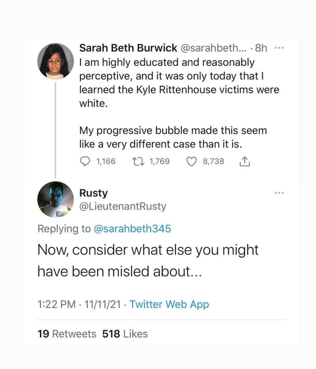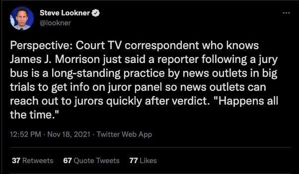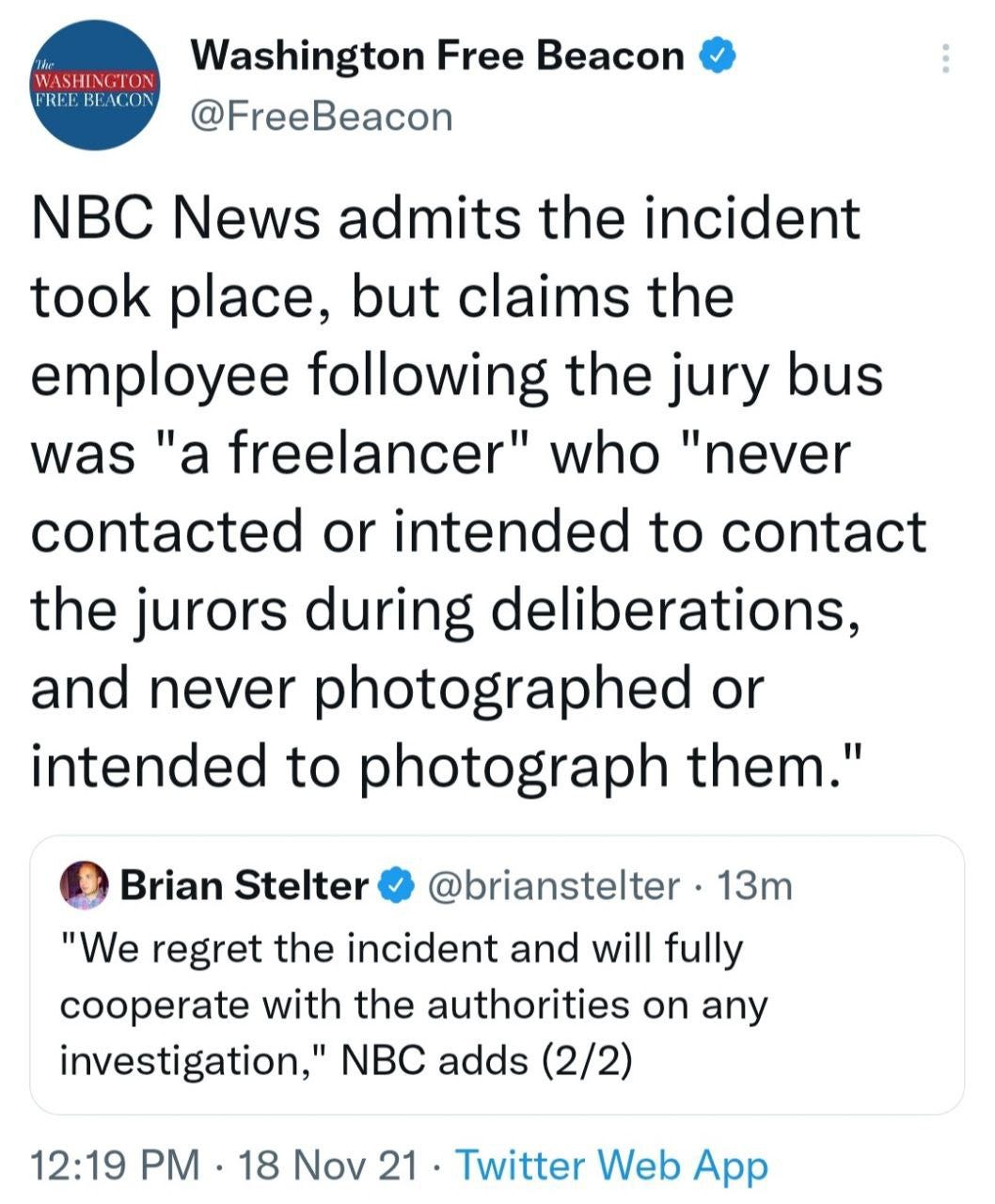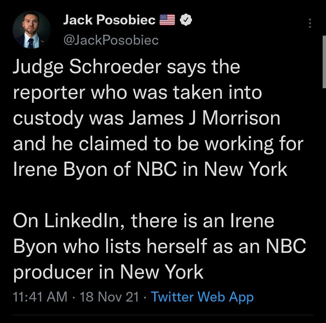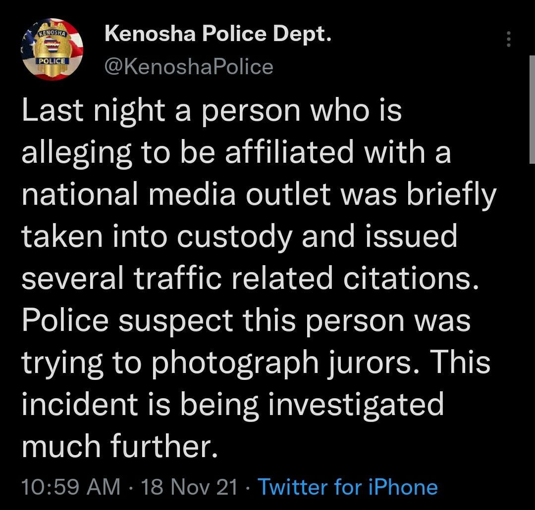 Election Wizard. ALERT: Based on the work by @Johnmcurtis, @DefNotDarth, and @FuarFearg, it appears the #Rittenhouse drone video was a cropped version of the video shown on Tucker Carlson. Twitter. Tim Pool. I believe ADA Kraus cropped and edited the evidence in the Rittenhouse trial, then provided a further cropped and compressed version to the defense and he needs to be questioned under oath. Its not definitive but heres my reasoning. [Thread.] Twitter. Mintz, H. Hearing reports @Kenosha_Sheriff arrested someone for following jurors on a bus, claimed to be from NBC or MSNBC....though a credentialed member of the network asked to identify a photo said he doesn't work for either, we are working to confirm more details. Twitter. [Note: Jury intimidation.] Kenosha Police Dept. Last night a person who is alleging to be affiliated with a national media outlet was briefly taken into custody and issued several traffic related citations. Police suspect this person was trying to photograph jurors. This incident is being investigated much further. Twitter. Havranek, A. According to the CourtTV engineer who has been running the feeds down in the media room -- a man outside was pretending to be with @MSNBC / @NBCNews. That person is "now a guest of the county." Twitter. [Note: “Person allegedly from NBC/MSNBC was instructed to follow the jury bus in the #Rittenhouse trial. Judge orders to exclude the two news outlets from the trial pending further investigation.”] il Donald Trumpo. Stop it! Who did this? Those Undercover Kenosha Feds are NOT in love and you know that!!! Rumble. Hoft, J. PROOF: MSNBC Producer Deletes Tweets and Twitter Account After Reportedly Instructing Journalist James Morrison to Follow Rittenhouse Jury Bus. The Gateway Pundit.