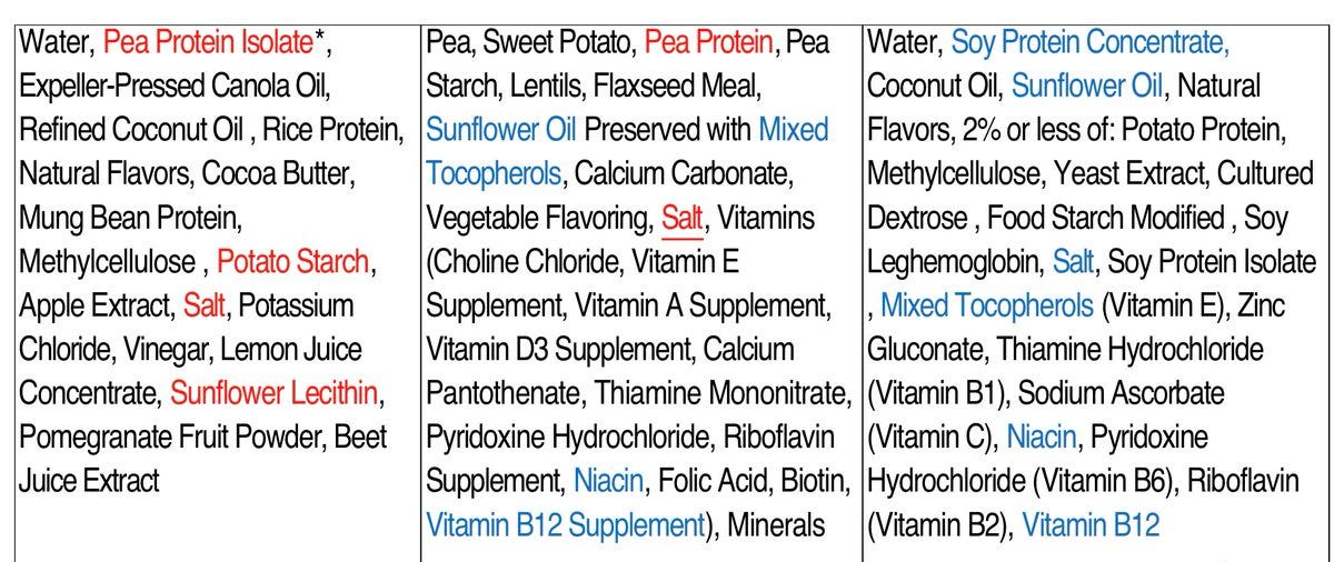 Marston, J. Impossible Foods raises $500m on road to possible IPO. Impossible Foods has raised a total of almost $2 billion as a result of this latest round, which was led by South Korea's Mirae Asset. AgFunderNews. [Notes: Again, the emperor wears no clothes. The ingredients are literally the ingredients in dog food, and the “fact checkers” have been all over trying to “debunk” this, so you know it’s well over the target. This requires no controversy: Why don’t people just compare the ingredients? WE will. See the images below.]