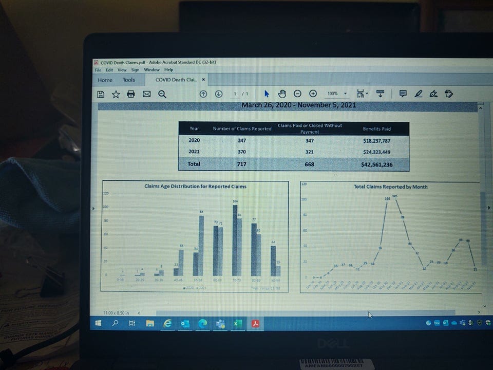 [Note: “These are death claims paid by the company I work for. They are Covid deaths paid based on what was received as cause of death on the death certificate. They represent about 12% of the total death claims. Look at what happened after the vax came out. More younger people died less older people than the prior year...”]