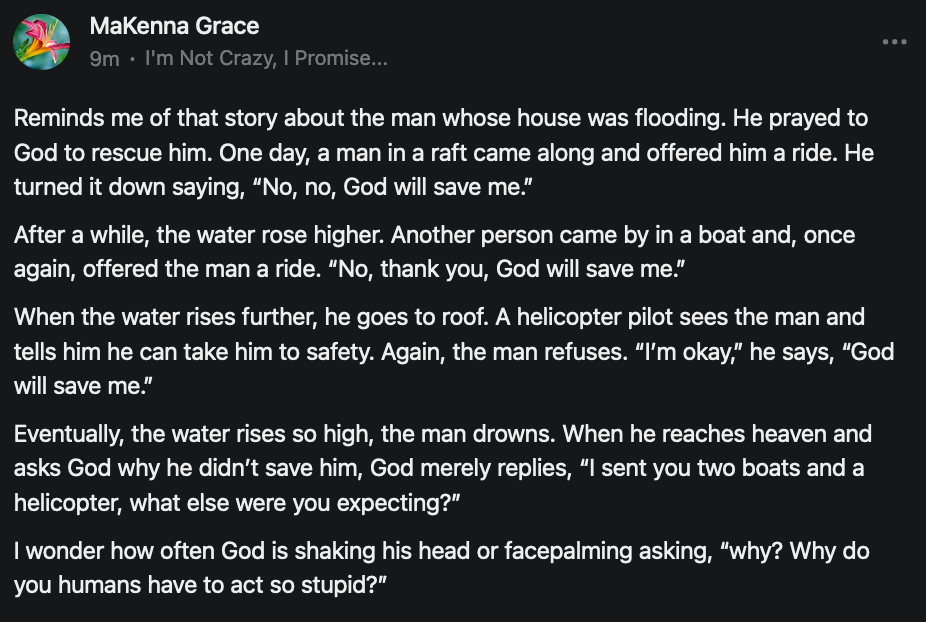 The literal disembodied HAND OF GOD is protruding from a freaking CLOUD trying to hand you a blessing… and you don’t WANT the blessing because it’s not coming in in exactly the way you expected it to?! And you’re gonna sit there with your arms crossed, throwing the cup shade?!?!