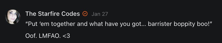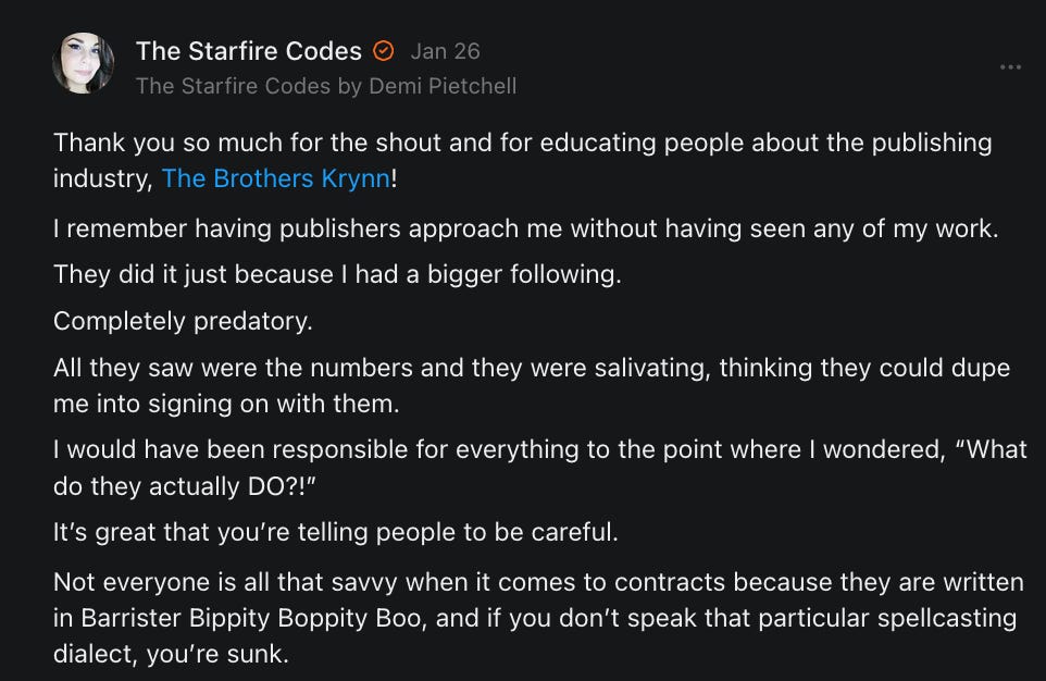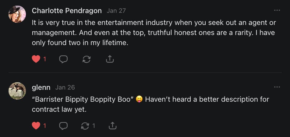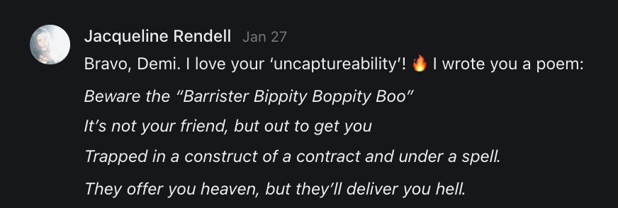 Dear, Demi, thank you for featuring me in this scroll! What a lovely surprise. And I especially enjoyed the barrister bibbity bobbity boo convo, so many nuggets of wisdom. I have a child who is writing a book and aspires to be an author, I will keep this tucked away to refer to. And I also struggle with marketing myself/my art. Thank you for the hilarity and information, I always appreciate your scrolls!