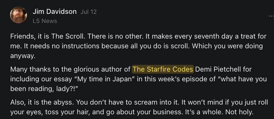 THE SCROLL is a weekly free-form multimedia stream of consciousness digest of interesting, informative, educational, and otherwise amusing posts and conversations from across Substack and amongst Substack writers and readers, carefully curated by the author.