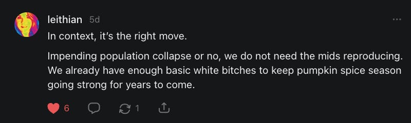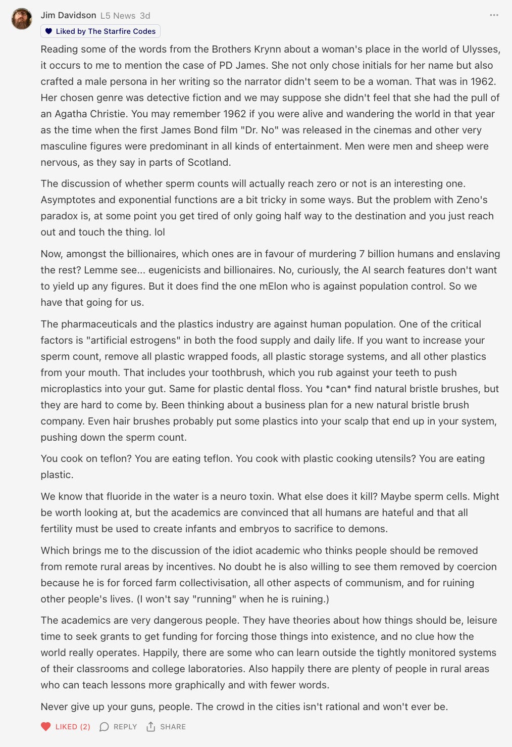As leithian pointed out this has the potential to hasten that population collapse barreling our way in the next few decades, and she noted that, of course, these morons believe in the lie of “overpopulation.”