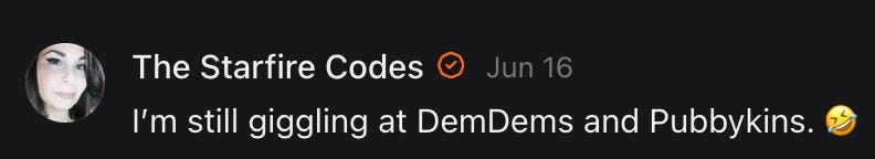 Next I LOVE pubbykins and dem dems and y’all sound like you were hanging out at Parks and Rec while Tom Haverford was explaining his food Nick names lmao - I’ll have some “long-ass rice”, “fry-fry chicky-chick”, and some “zerts” with deez dem dems please! ROFL. I’ll put a link to the scene in my restack.