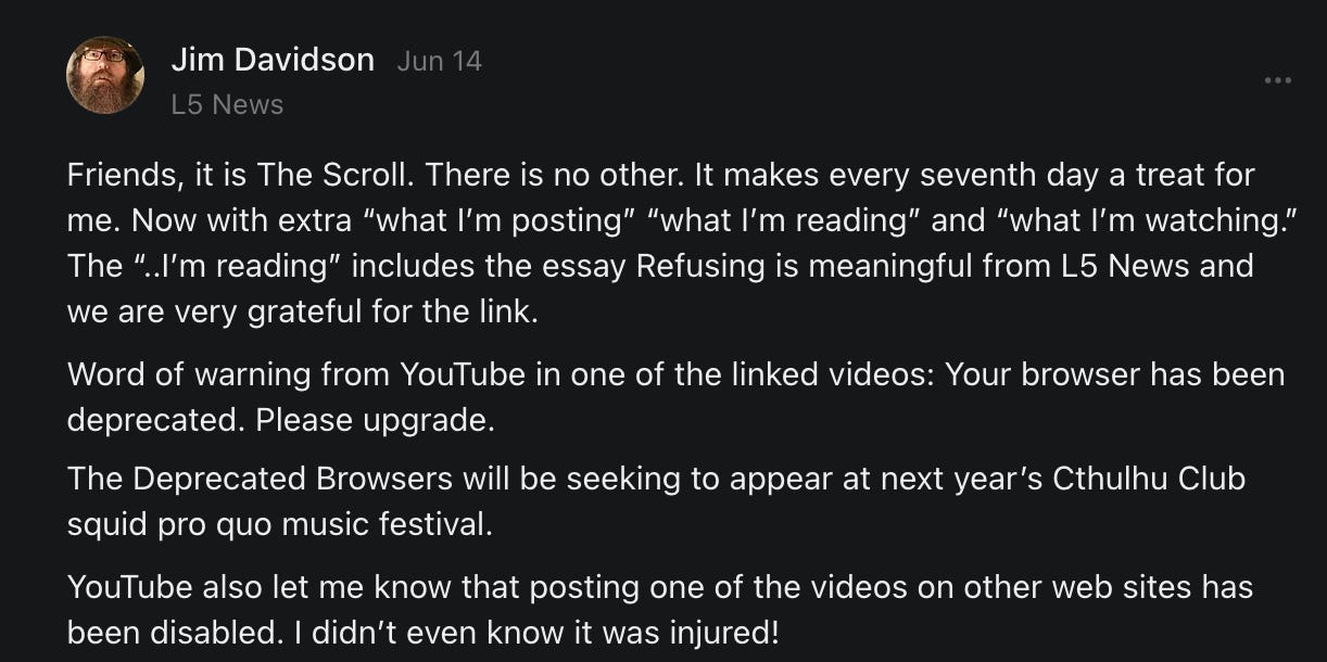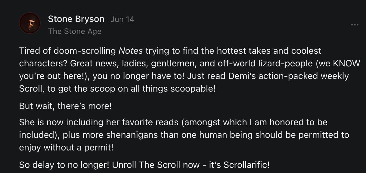 THE SCROLL is a weekly free-form multimedia stream of consciousness digest of interesting, informative, educational, and otherwise amusing posts and conversations from across Substack and amongst Substack writers and readers, carefully curated by the author.