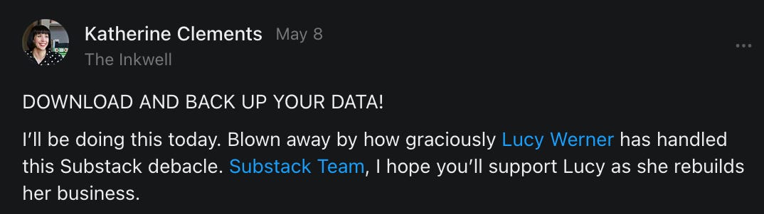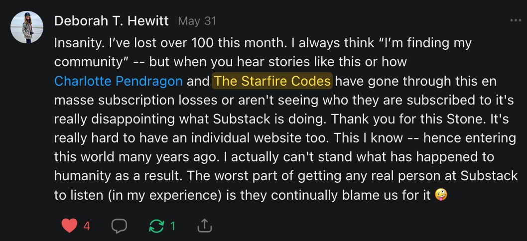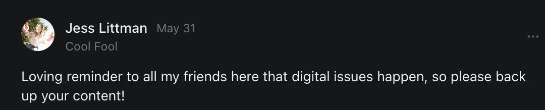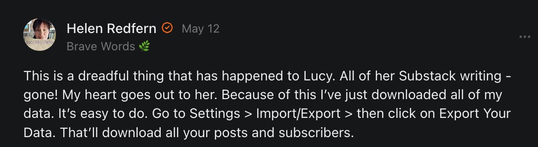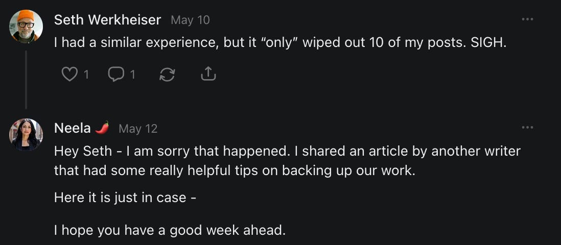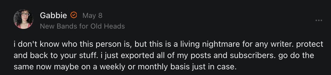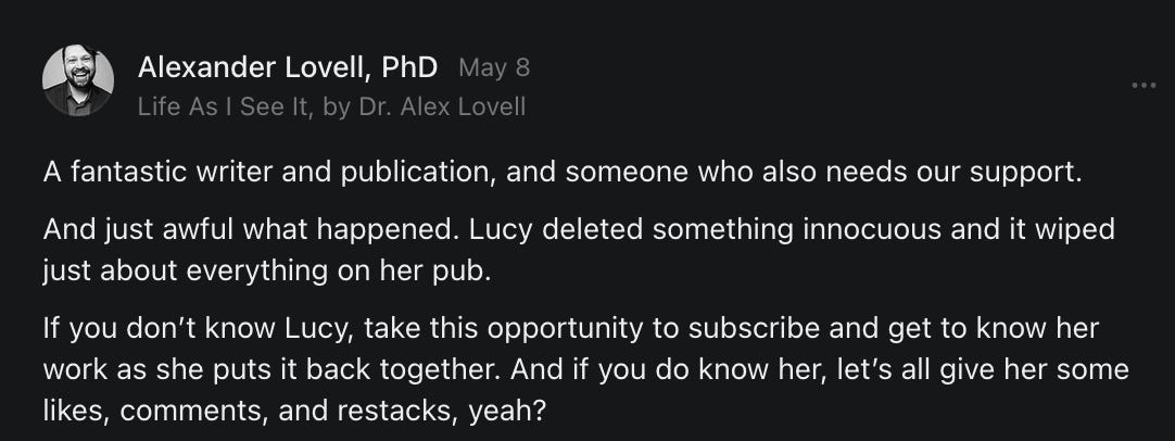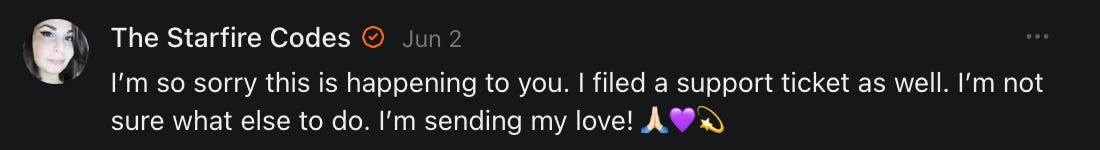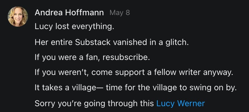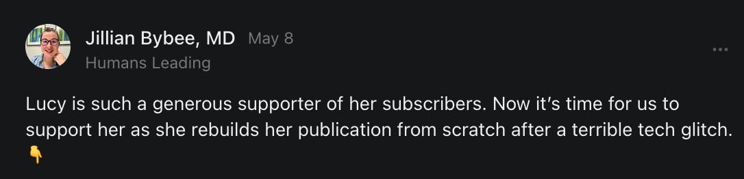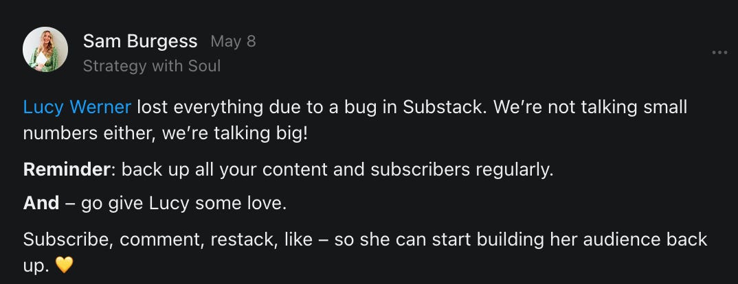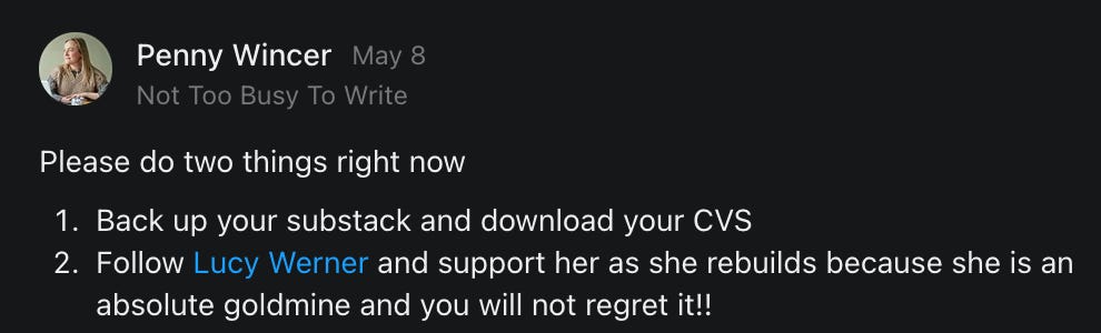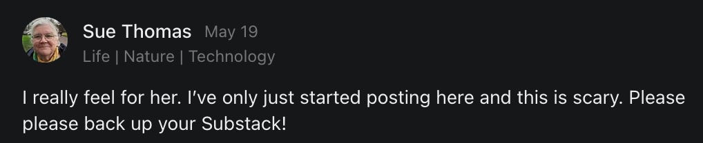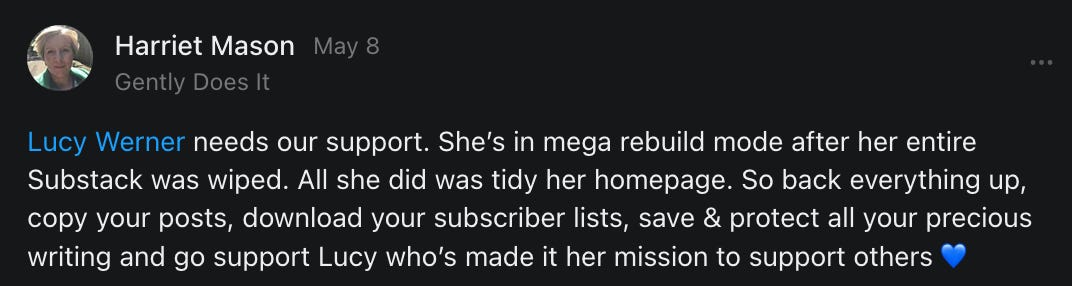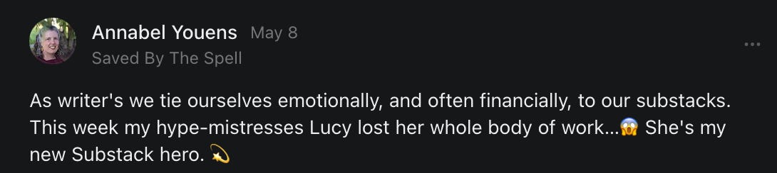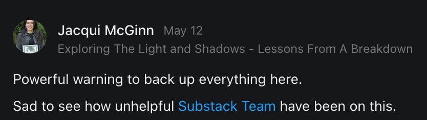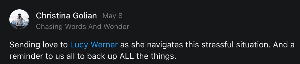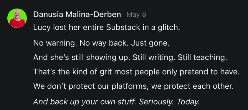 , , and to help them rebuild their audiences. The following posts are a testament to what this community can do for each other when they band together and make it happen. Please do share their stories and help them out. If this has also happened to you or someone you know, please drop a comment and/or link to the story so that we may support them in rebuilding as well. Also, do make a backup of your Substack just in case. Thanks in advance!]When you get a chance, please feel free to scroll through the special thanks list below and follow/subscribe to each other to show our SCROLL community some love for everything they do! 🙏🏻💜💫