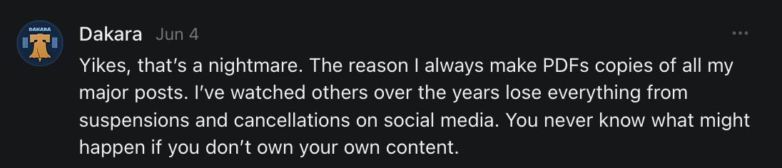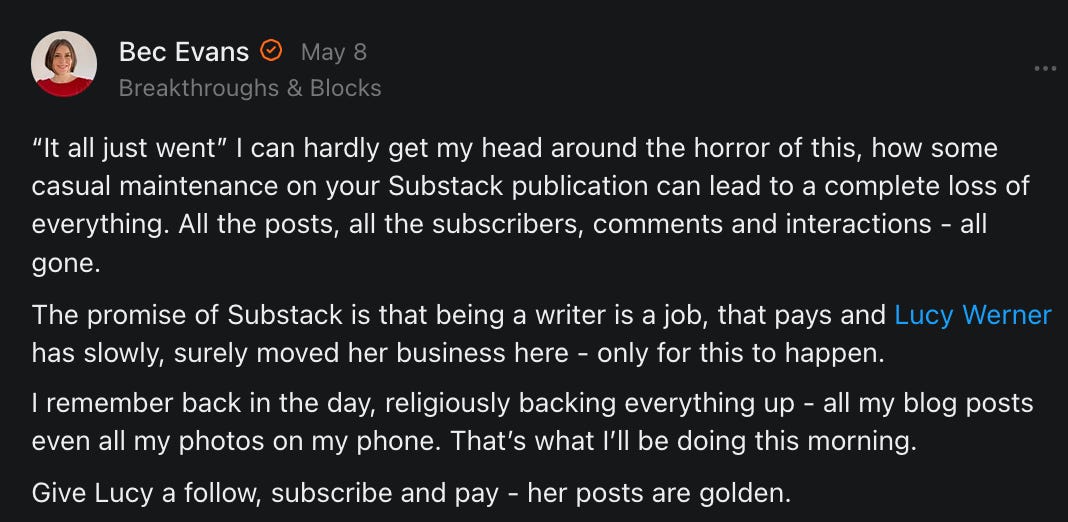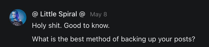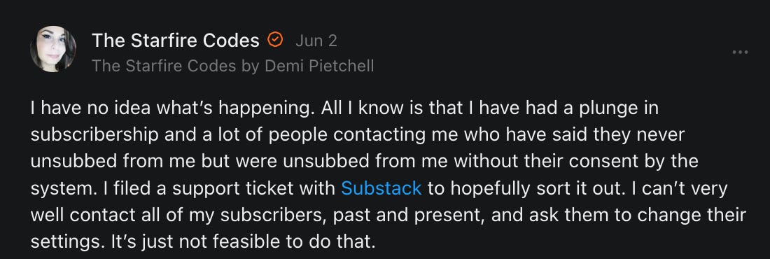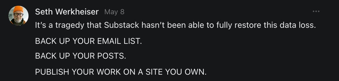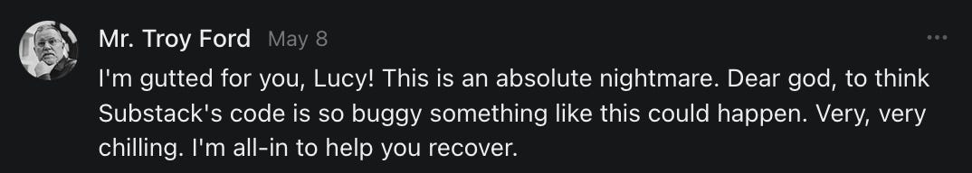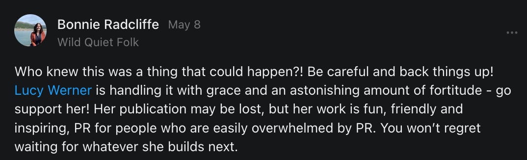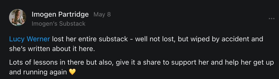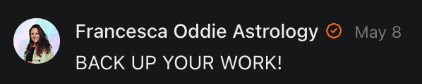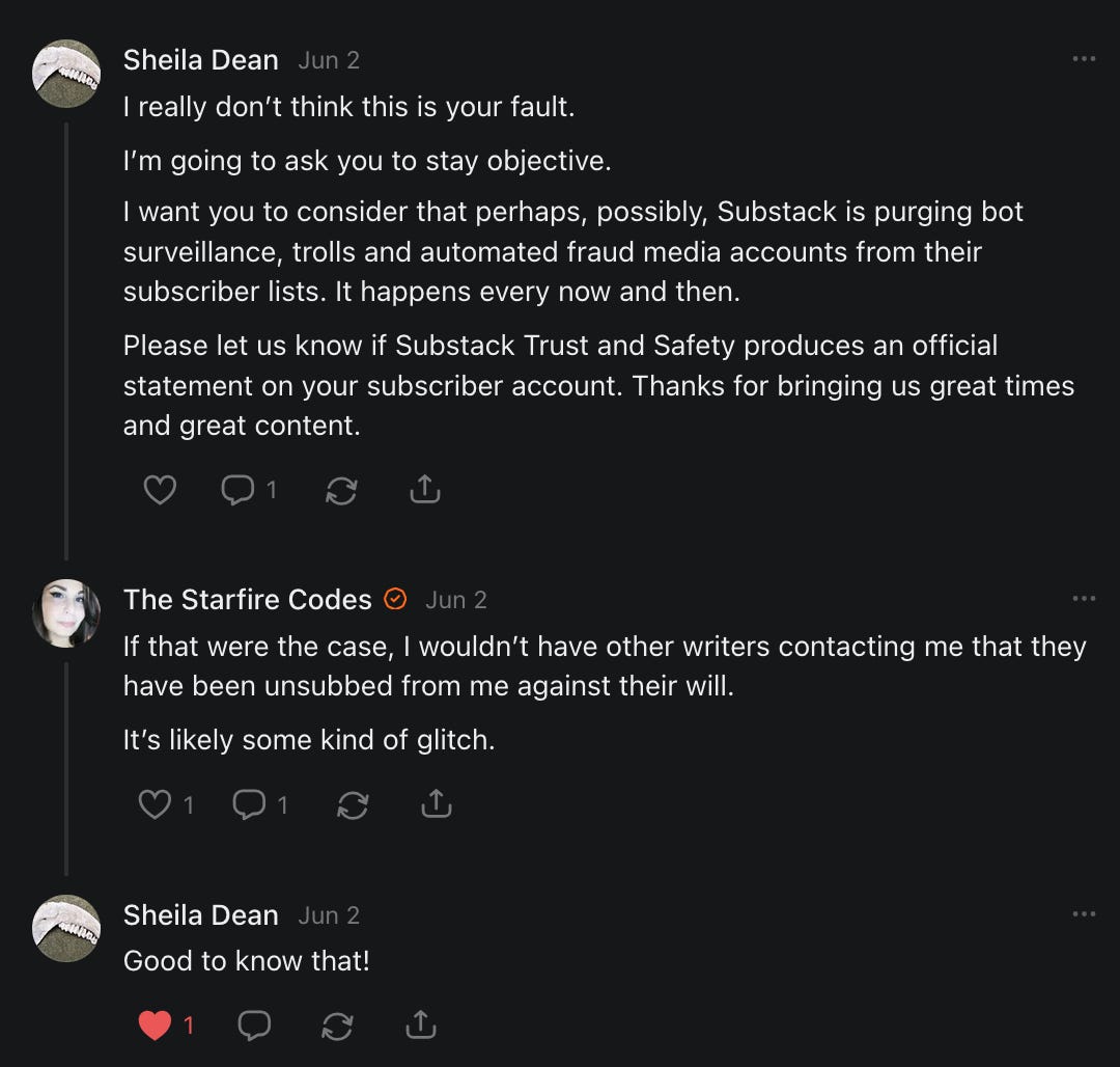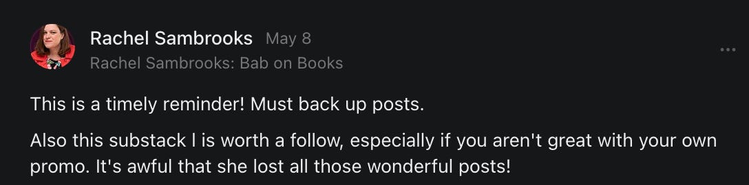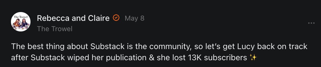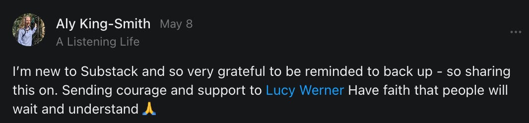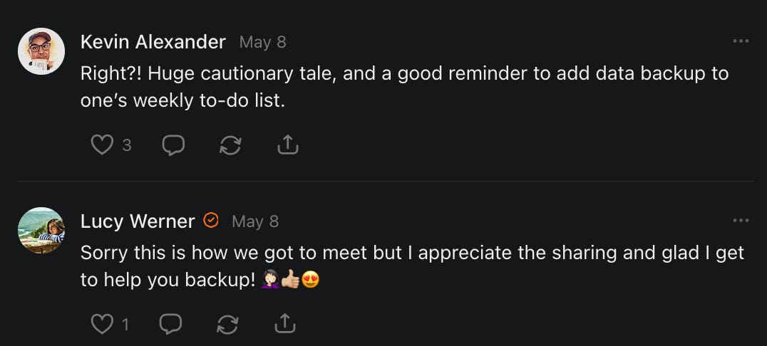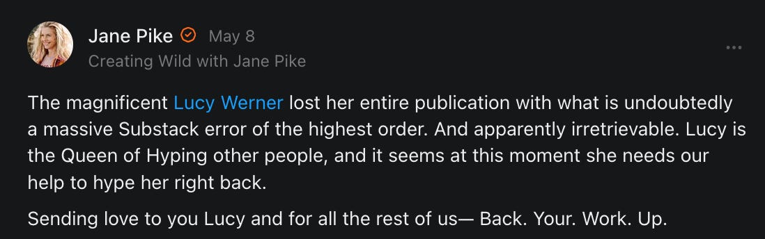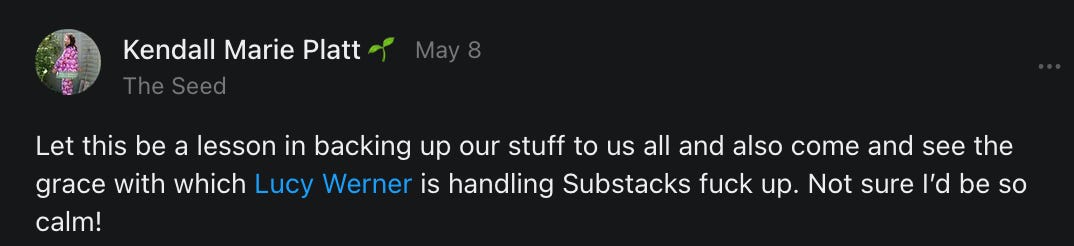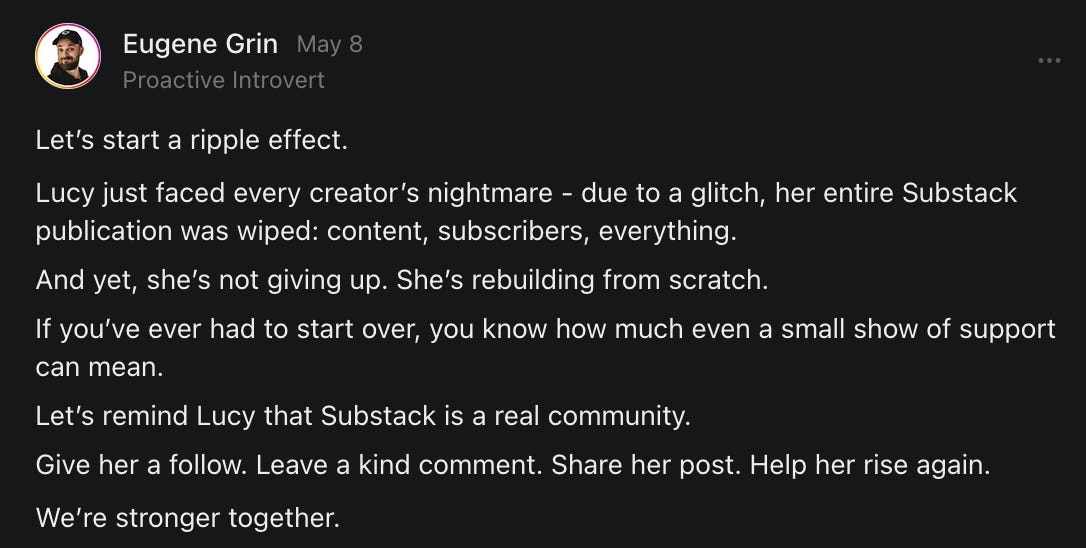 , , and to help them rebuild their audiences. The following posts are a testament to what this community can do for each other when they band together and make it happen. Please do share their stories and help them out. If this has also happened to you or someone you know, please drop a comment and/or link to the story so that we may support them in rebuilding as well. Also, do make a backup of your Substack just in case. Thanks in advance!]When you get a chance, please feel free to scroll through the special thanks list below and follow/subscribe to each other to show our SCROLL community some love for everything they do! 🙏🏻💜💫