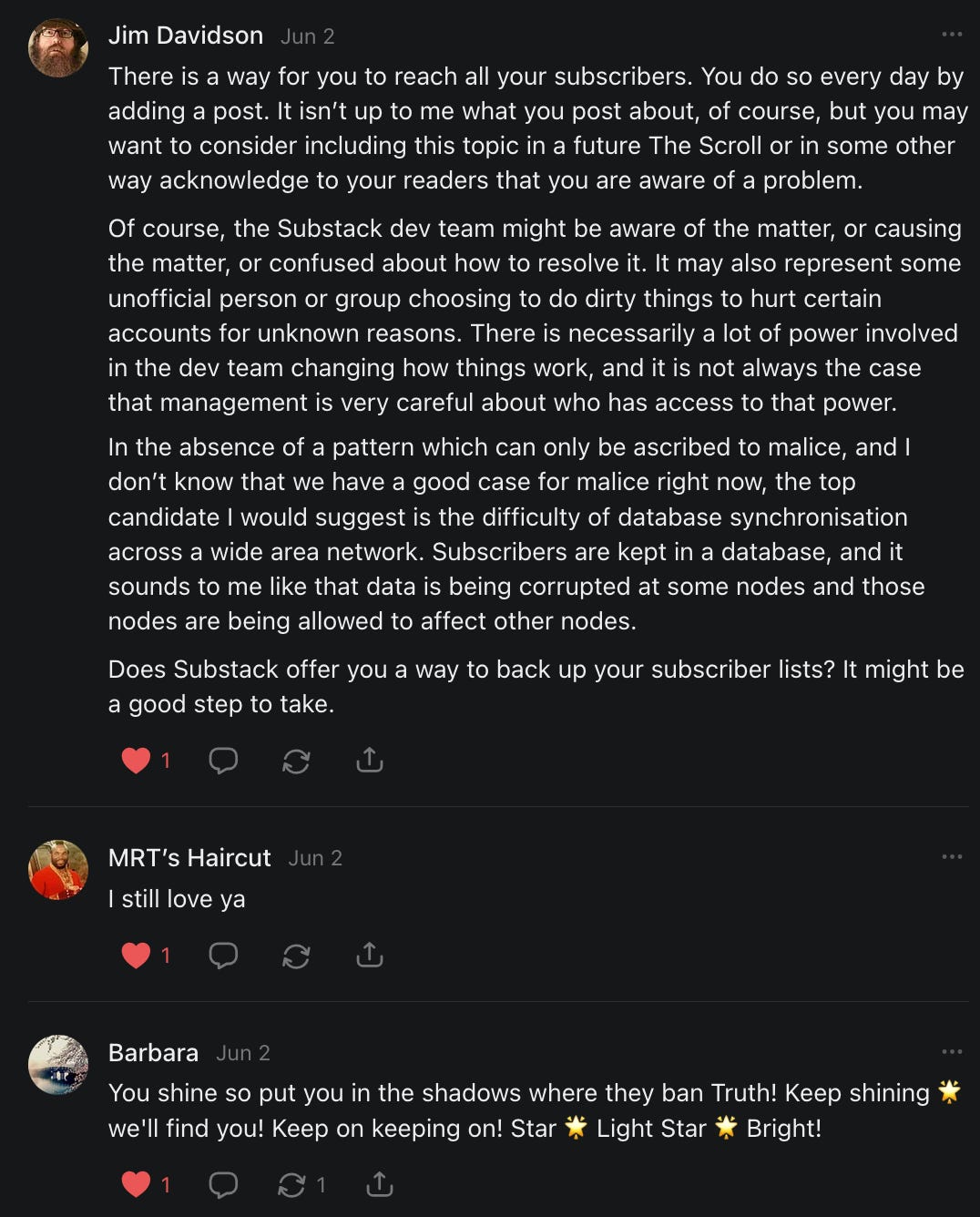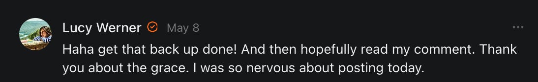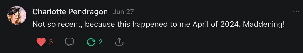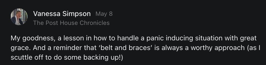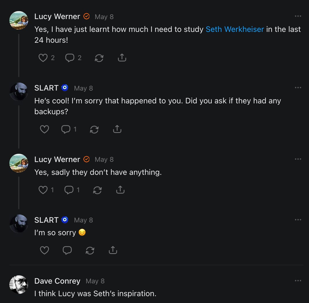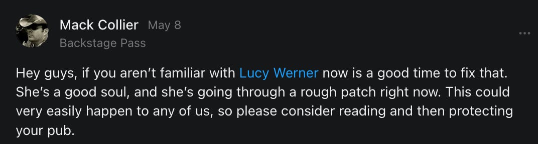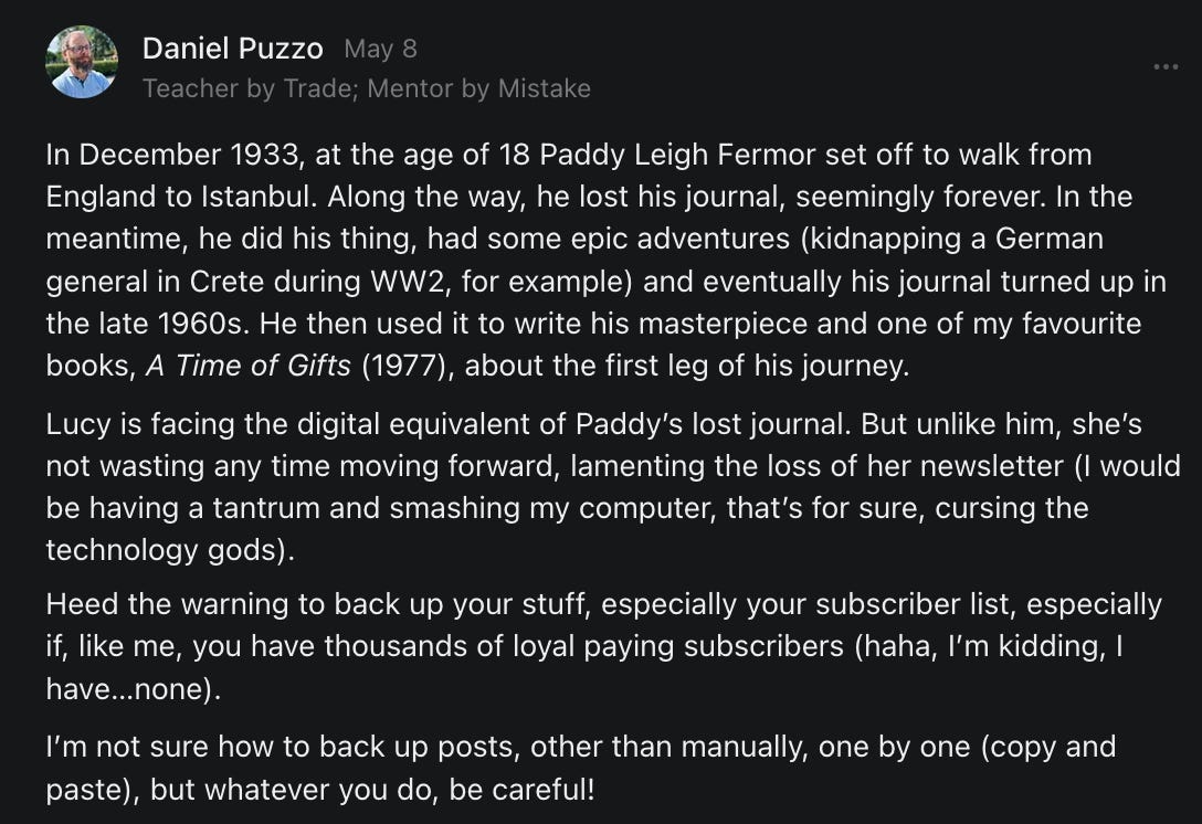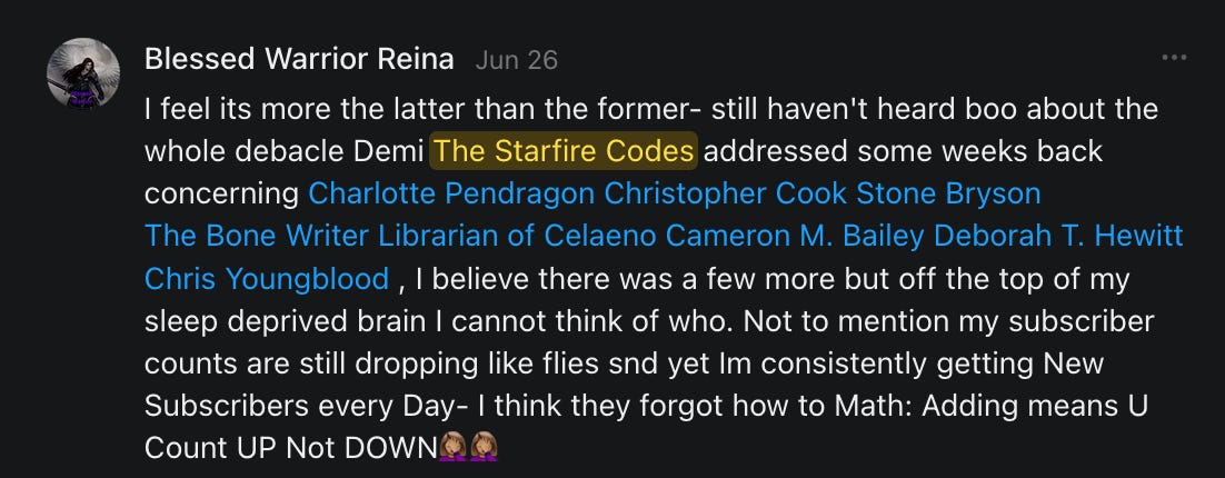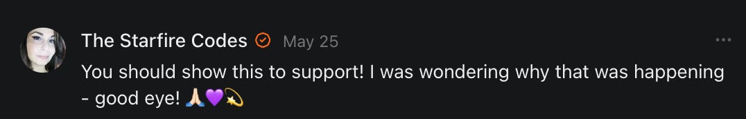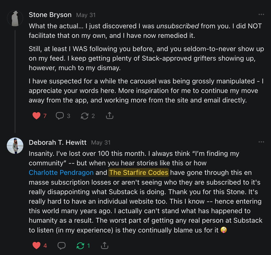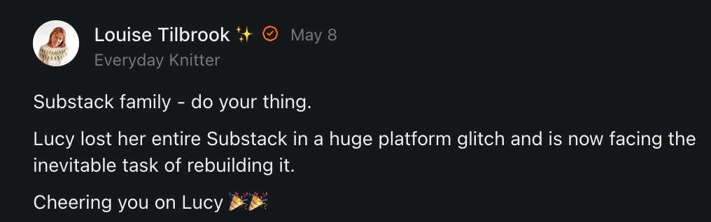 , , and to help them rebuild their audiences. The following posts are a testament to what this community can do for each other when they band together and make it happen. Please do share their stories and help them out. If this has also happened to you or someone you know, please drop a comment and/or link to the story so that we may support them in rebuilding as well. Also, do make a backup of your Substack just in case. Thanks in advance!]When you get a chance, please feel free to scroll through the special thanks list below and follow/subscribe to each other to show our SCROLL community some love for everything they do! 🙏🏻💜💫