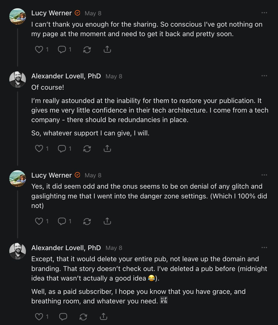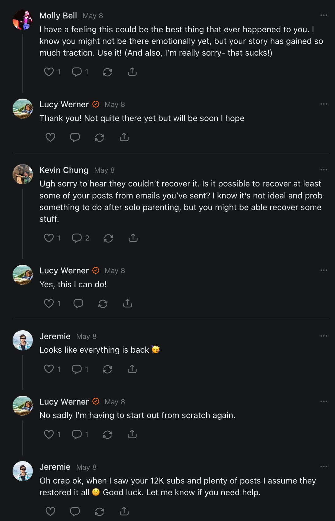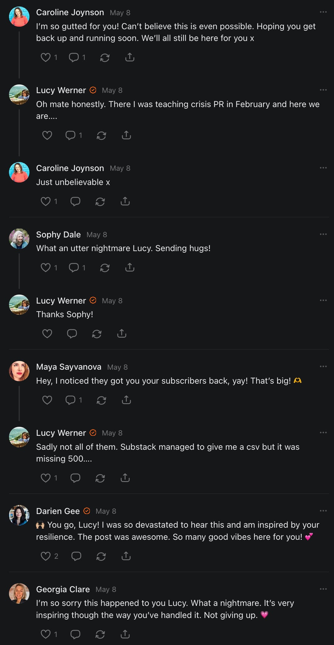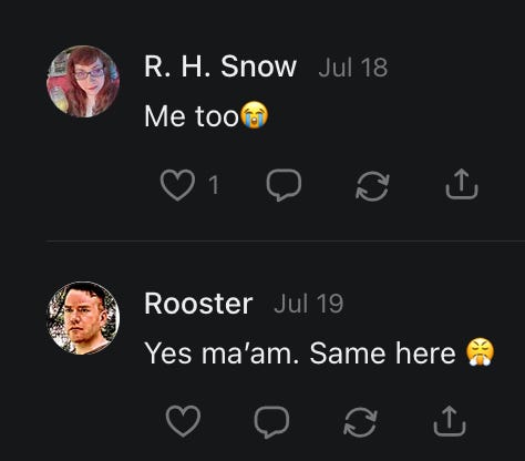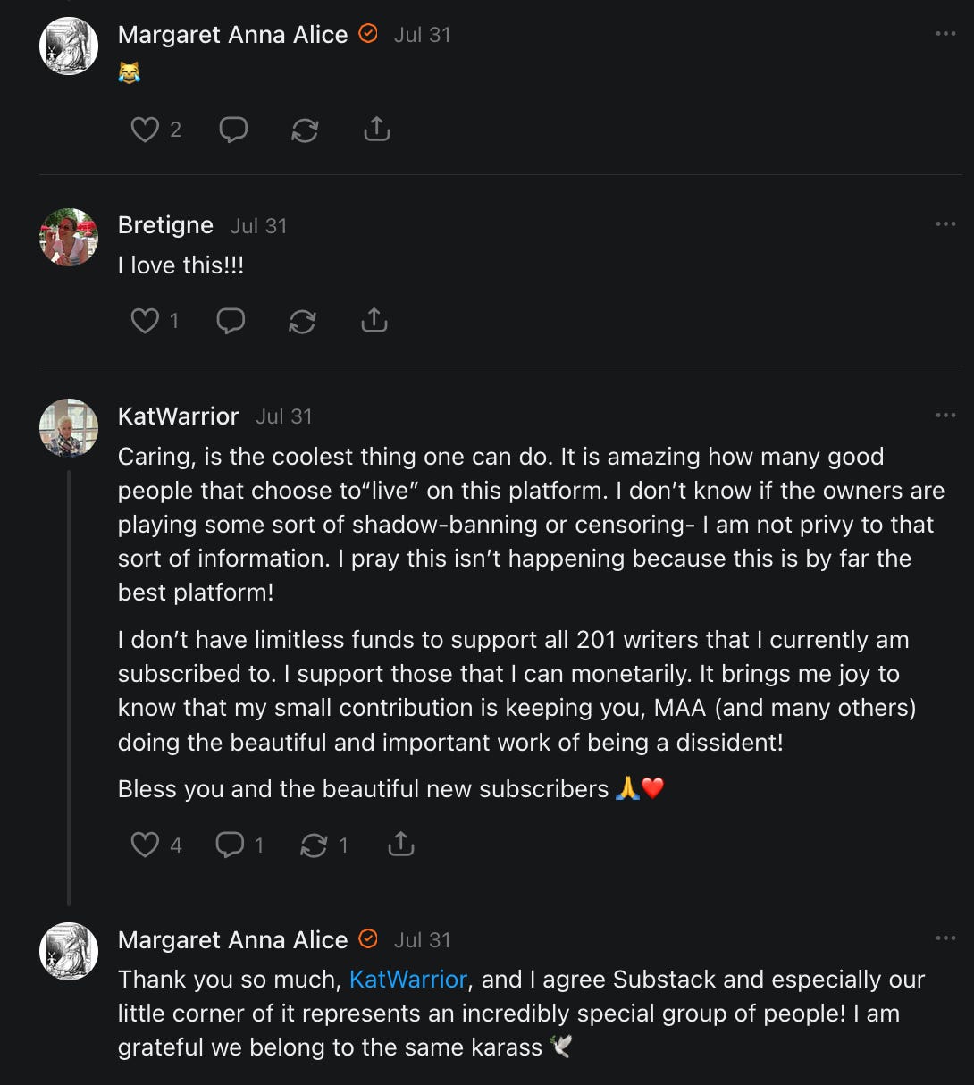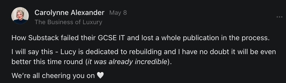 , , and to help them rebuild their audiences. The following posts are a testament to what this community can do for each other when they band together and make it happen. Please do share their stories and help them out. If this has also happened to you or someone you know, please drop a comment and/or link to the story so that we may support them in rebuilding as well. Also, do make a backup of your Substack just in case. Thanks in advance!]When you get a chance, please feel free to scroll through the special thanks list below and follow/subscribe to each other to show our SCROLL community some love for everything they do! 🙏🏻💜💫