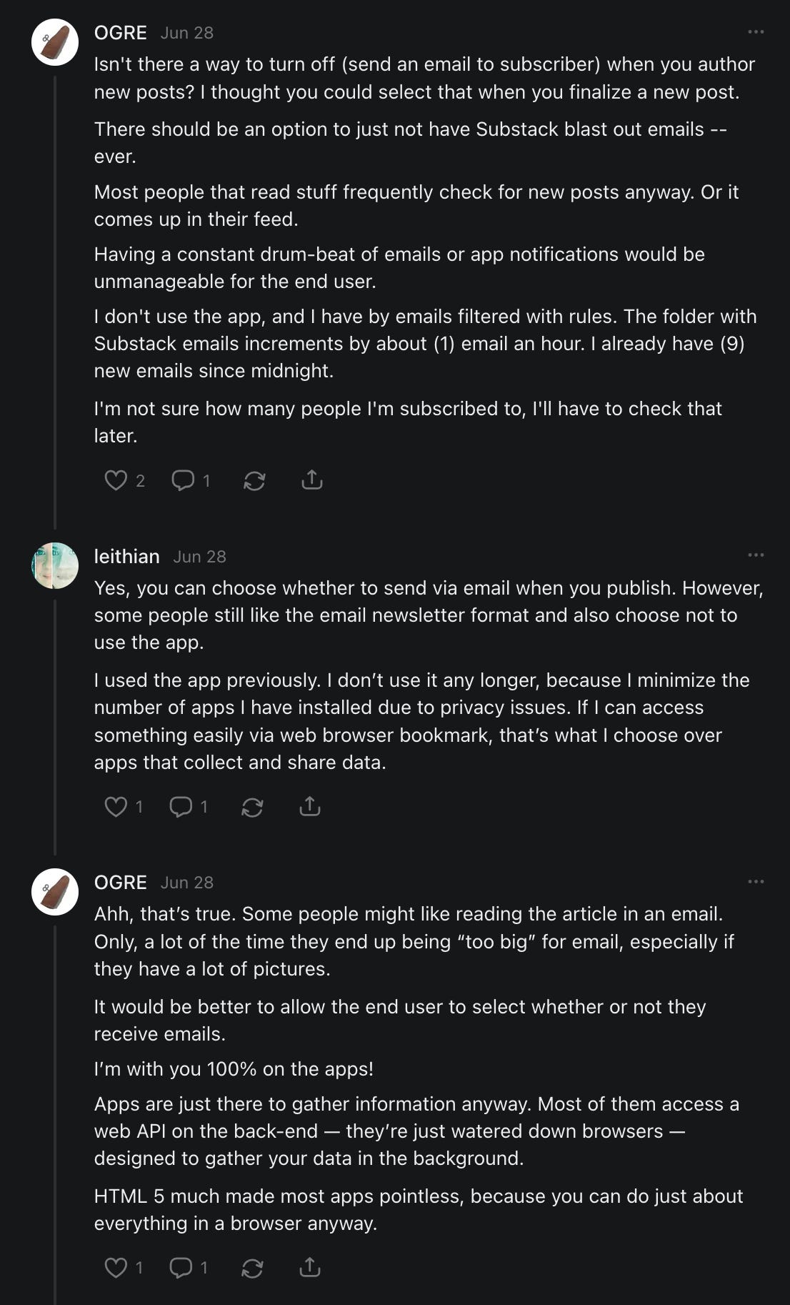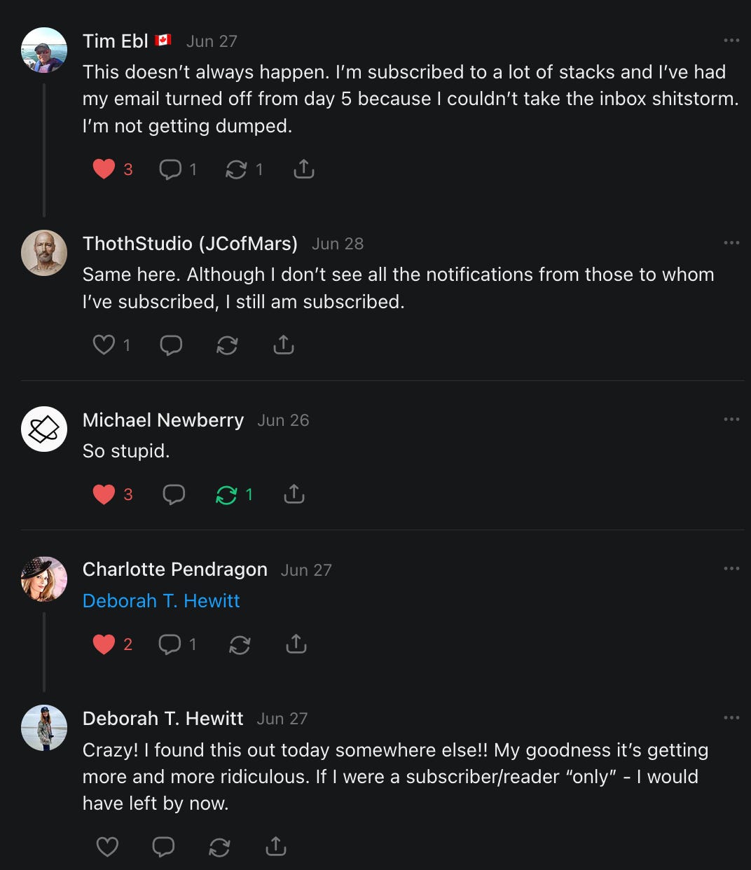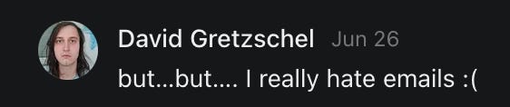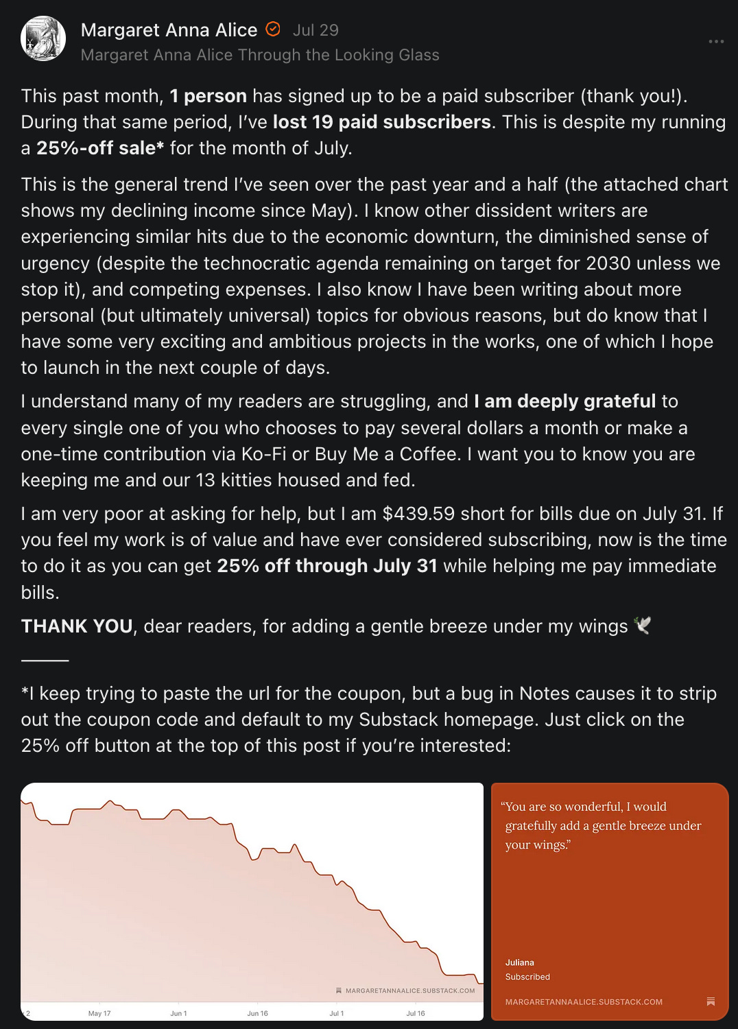 I'm sure by 2 p.m. I'll have more than 20 people that disabled their emails. My total subscribers have dropped by 30 in 30 days. My paid subscribers have dropped from 311 to 270 (now back to 272) in the last 11 months.