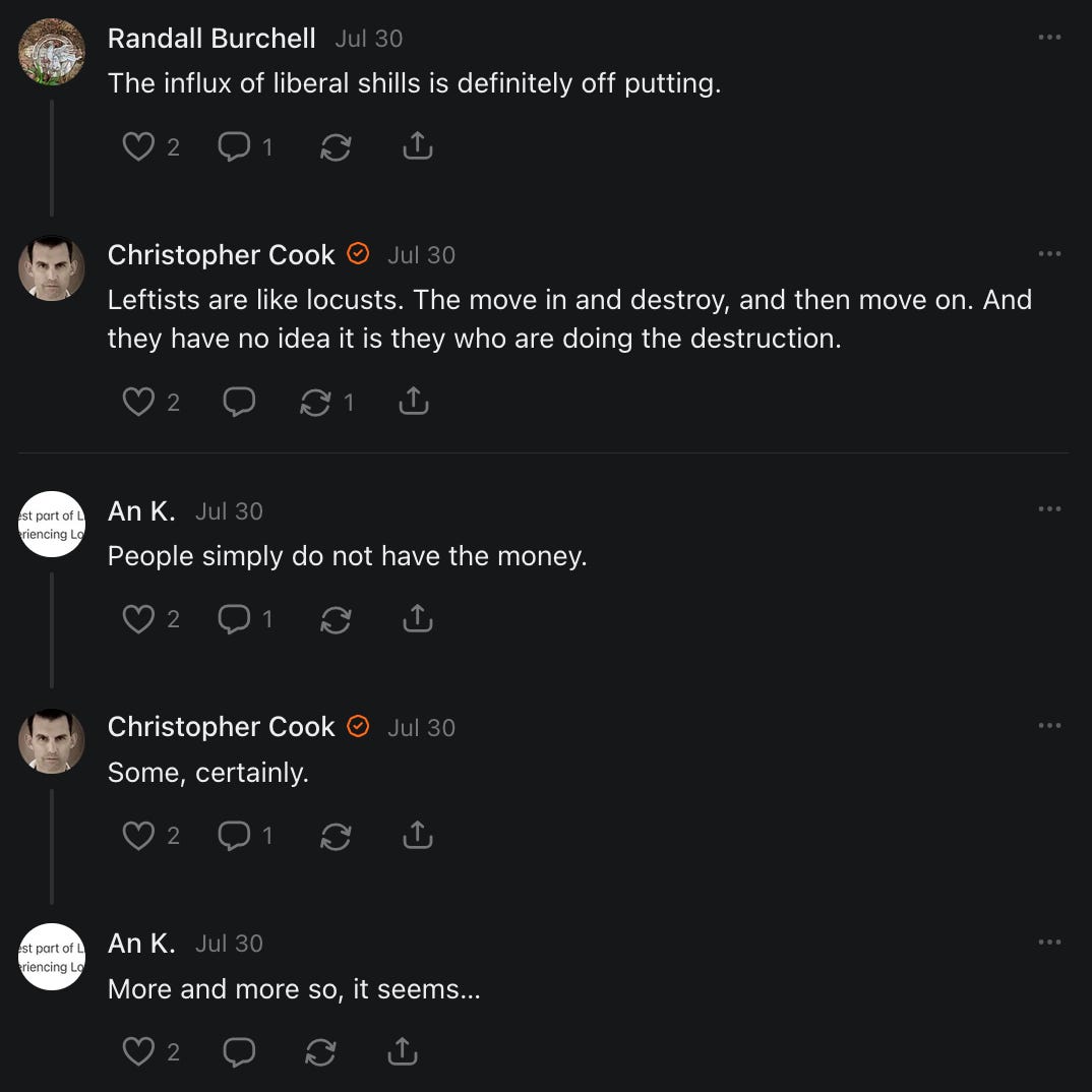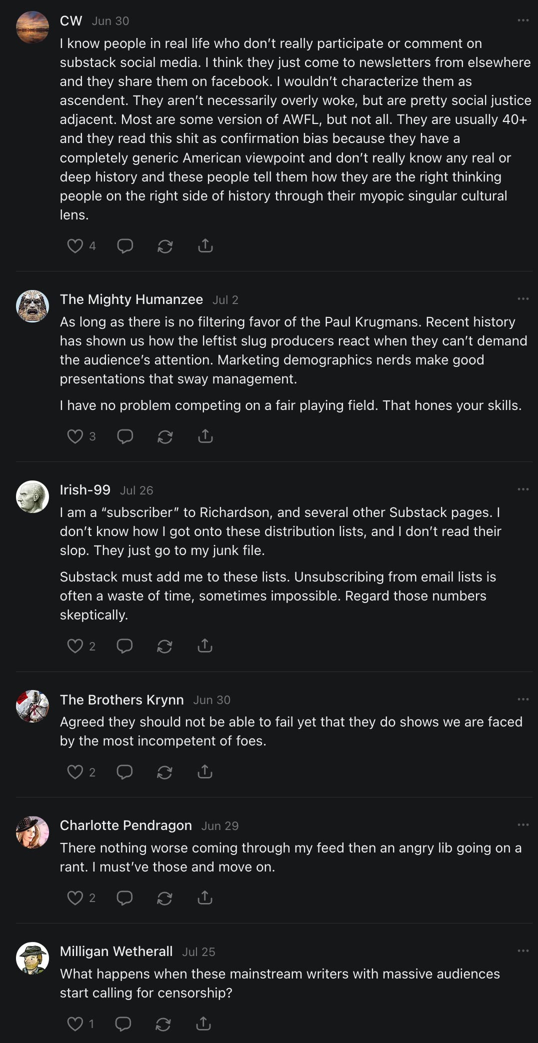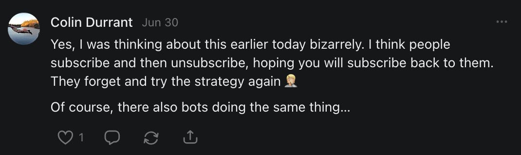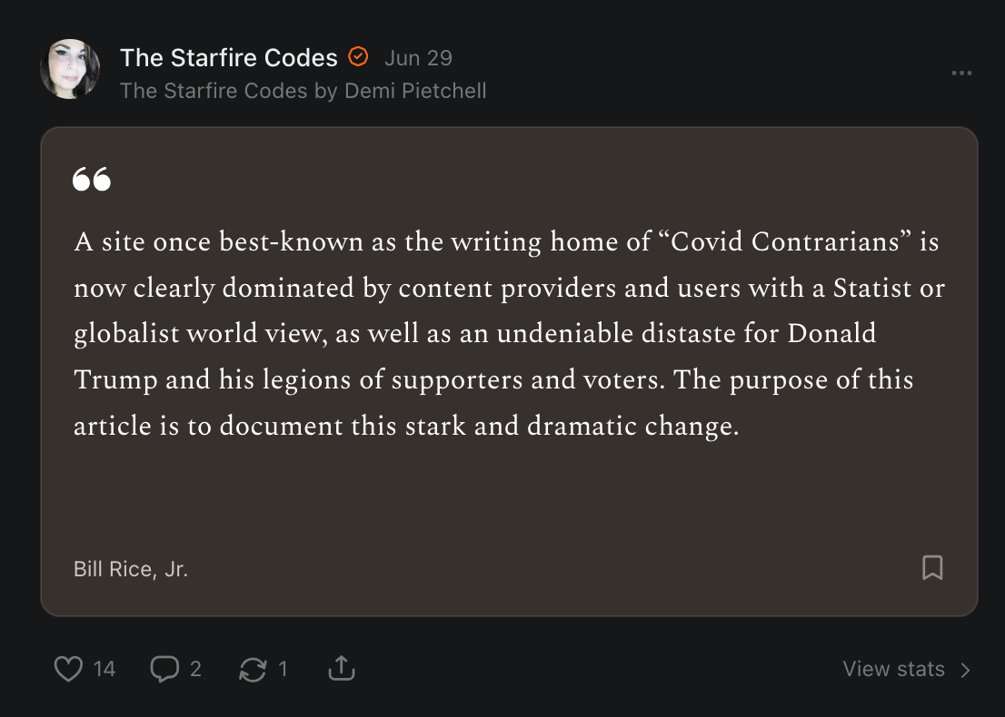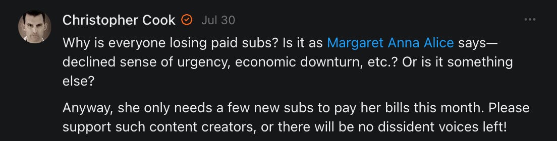 On net, I now lose 1 to 2 subscribers with every story I post. Almost all of these subscribers are "free." I've also written at least 20 articles on "curious trends" on Substack. That probably doesn't make me popular with any would-be Big Brother types.