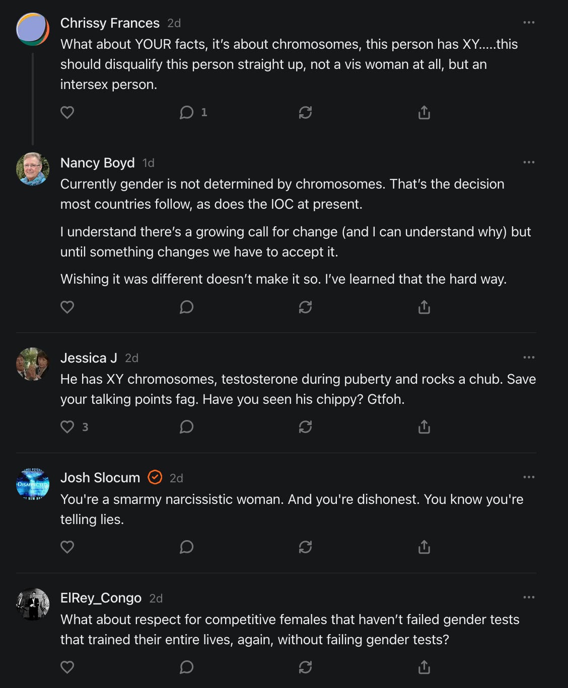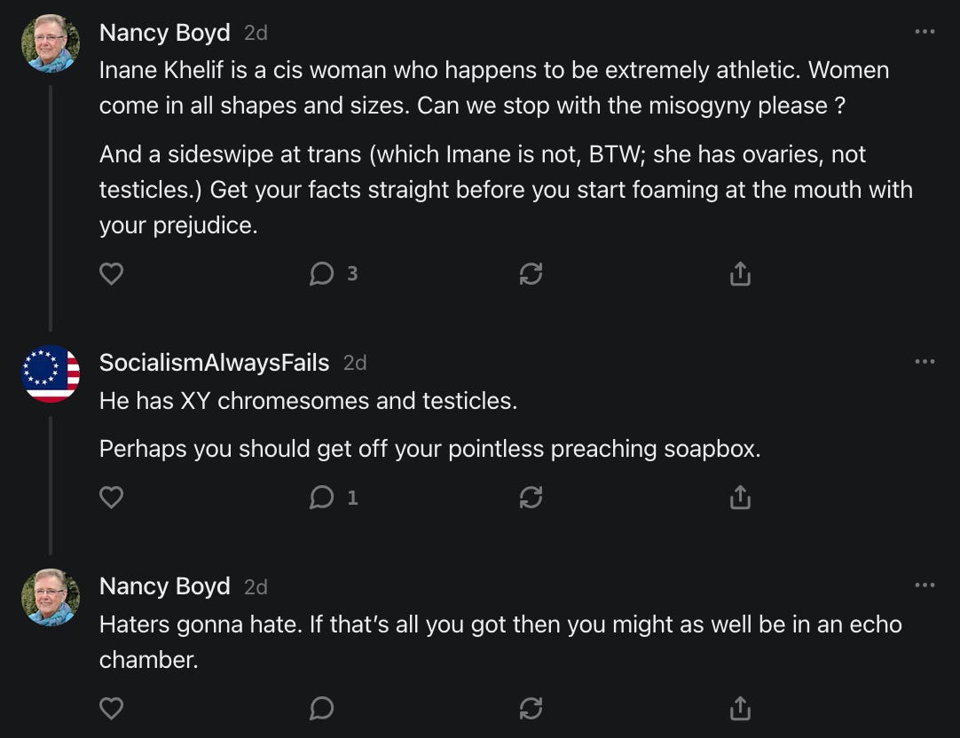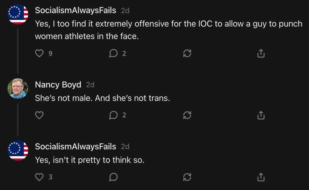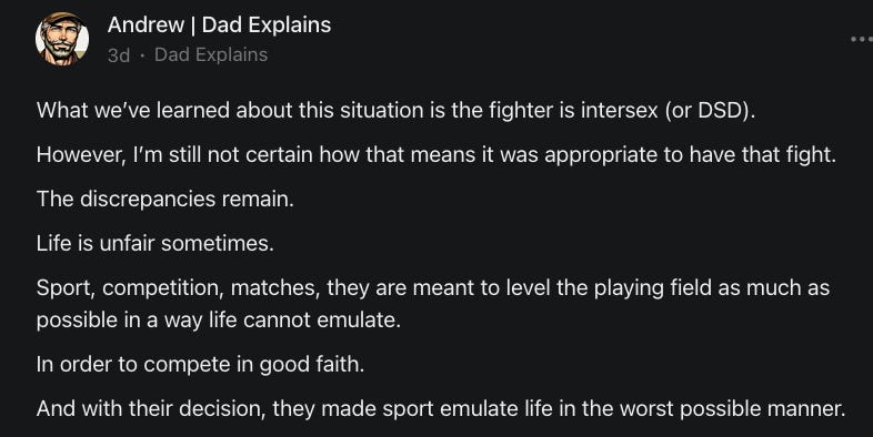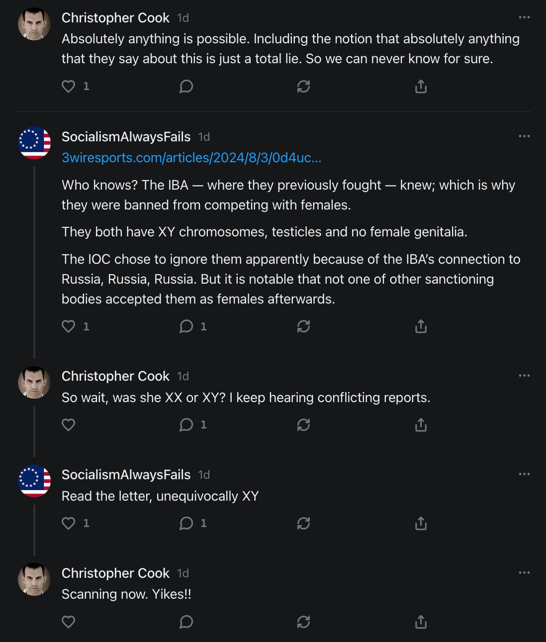 [NOTE: The boxer in question has been proven in the past to have a Y chromosome. Please reference: Abrahamson, A. (2024). IBA letter to IOC, June 2023: Boxer's 'DNA was that of a male consisting of XY chromosomes.' 3 Wire Sports.]