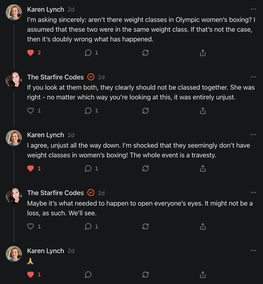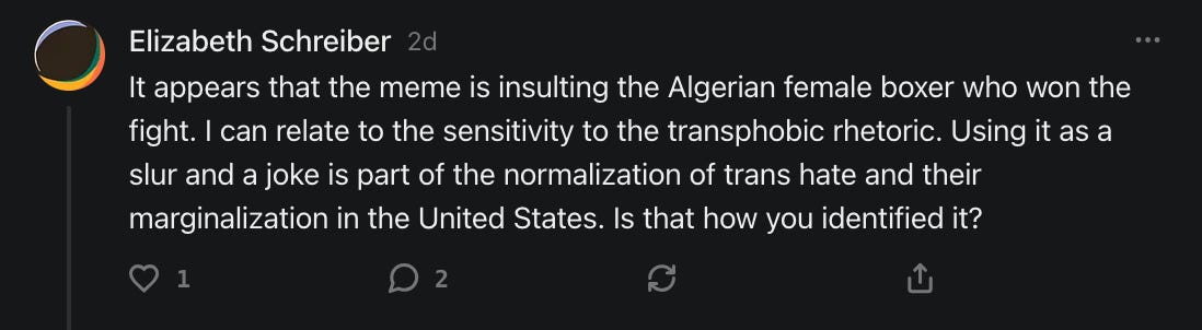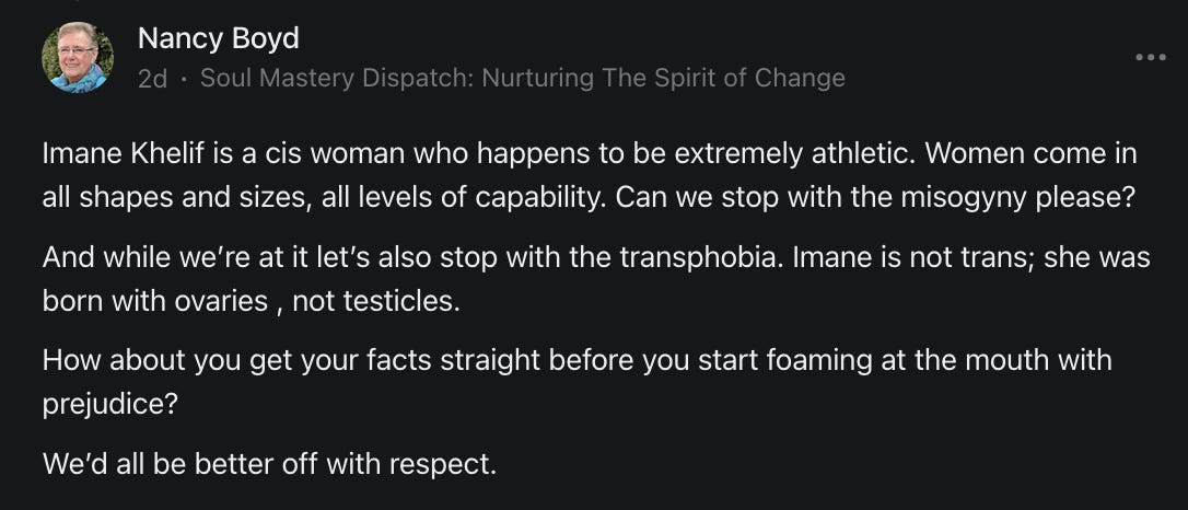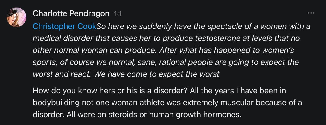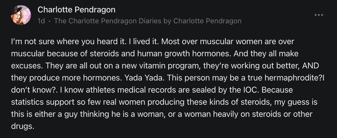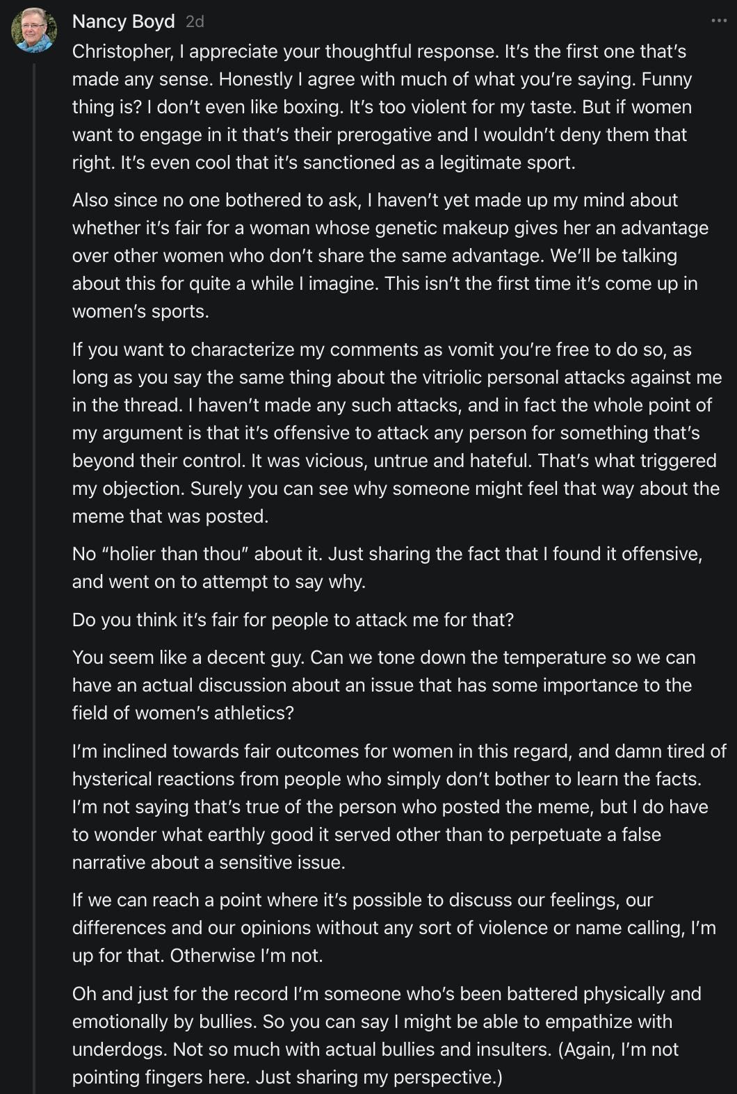 [NOTE: The boxer in question has been proven in the past to have a Y chromosome. Please reference: Abrahamson, A. (2024). IBA letter to IOC, June 2023: Boxer's 'DNA was that of a male consisting of XY chromosomes.' 3 Wire Sports.]