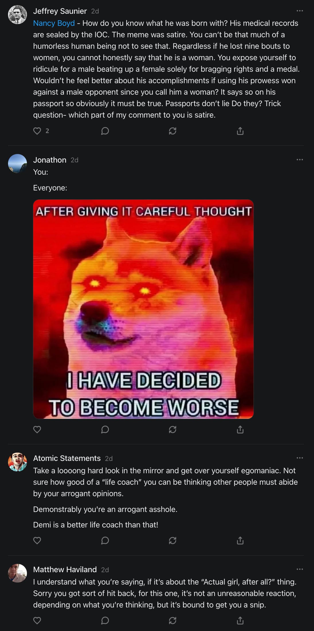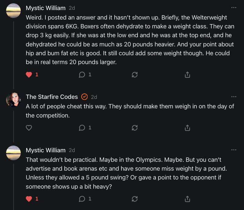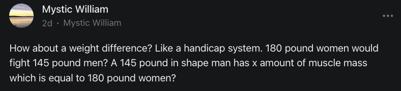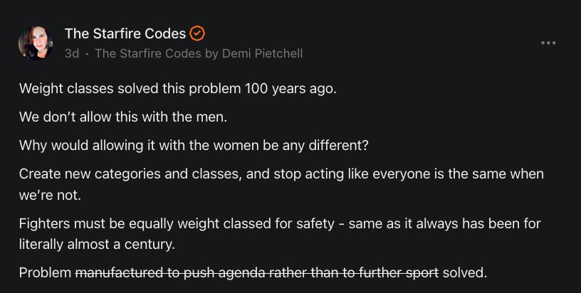 Just make more categories with physical qualification factors that are purely biological for the sake of properly matching opponents within their classes - like weight, height, and muscle density - and leave the politics about “gender” out of it completely.