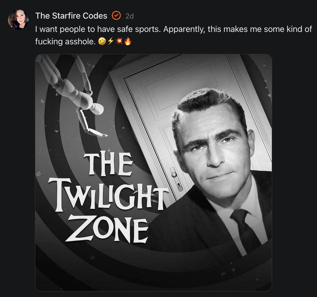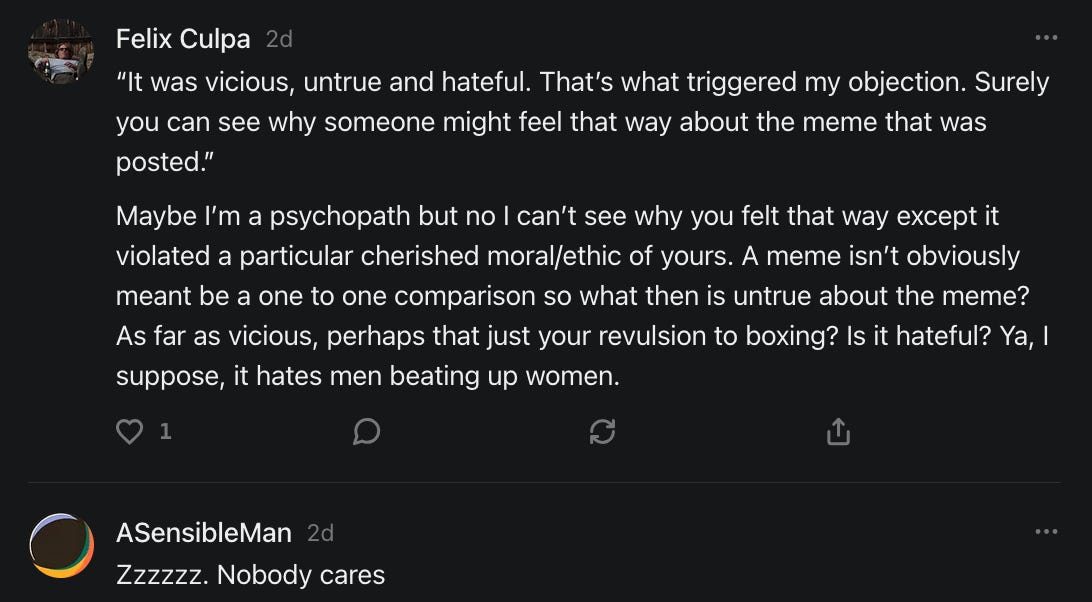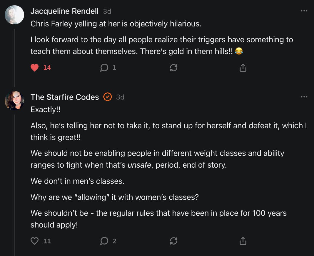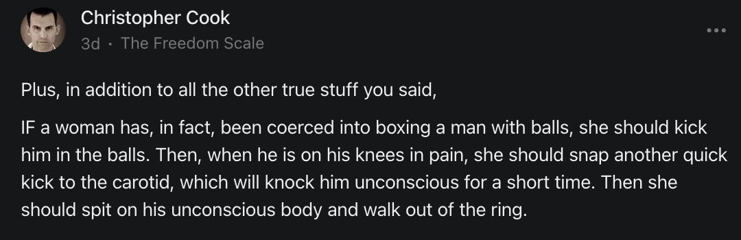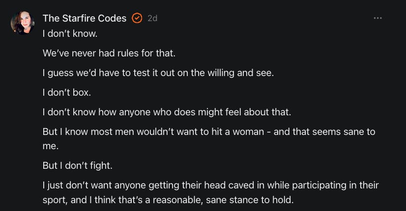 So, they either react to a woman being punched in the face by a biological male and draw the line, or they still cease to care until someone gets horribly injured or dies.