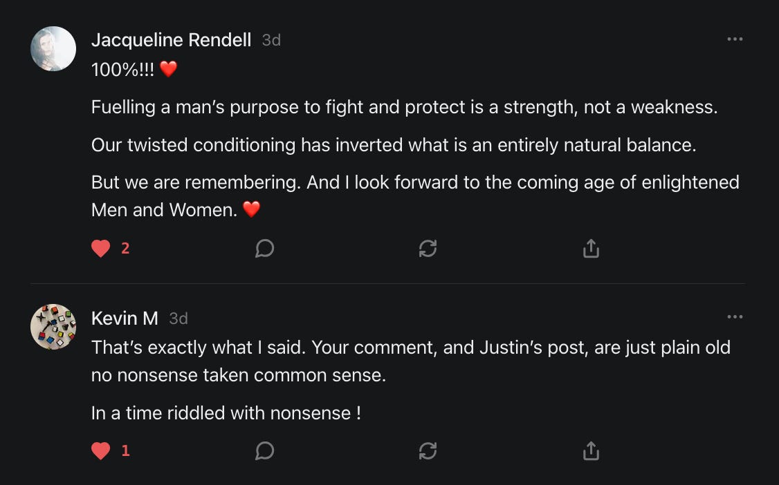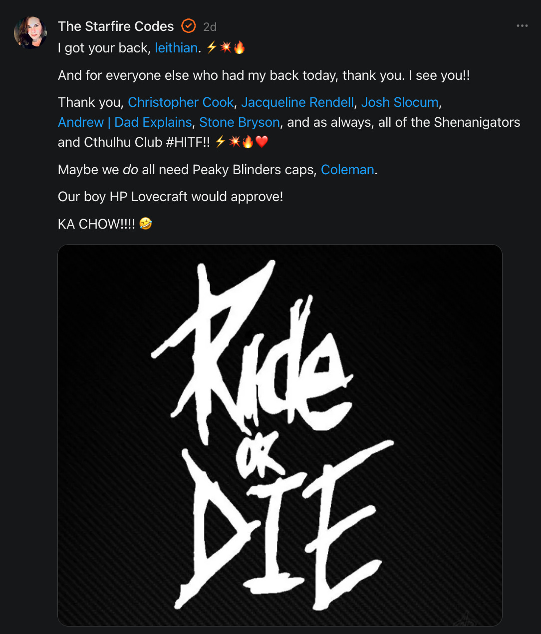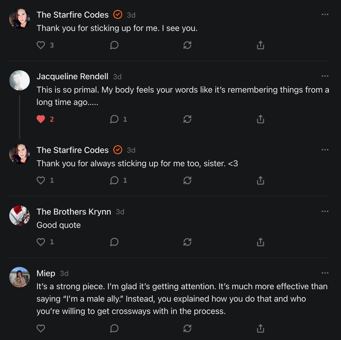 Let’s see some action. Come to each other’s aid. If you see someone taking a hit, put your ride or die big boy pants on and STEP IN. Even being a woman, I have and I always will. (And those of you who have stepped in for me in the past - I see you, I appreciate it, and you better bet I will be front and center if I EVER see anyone doing it to YOU.)