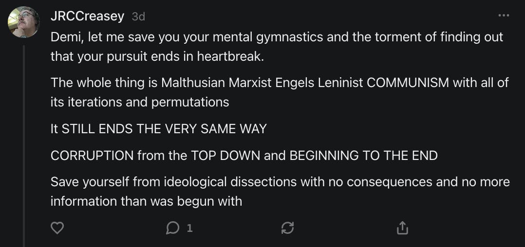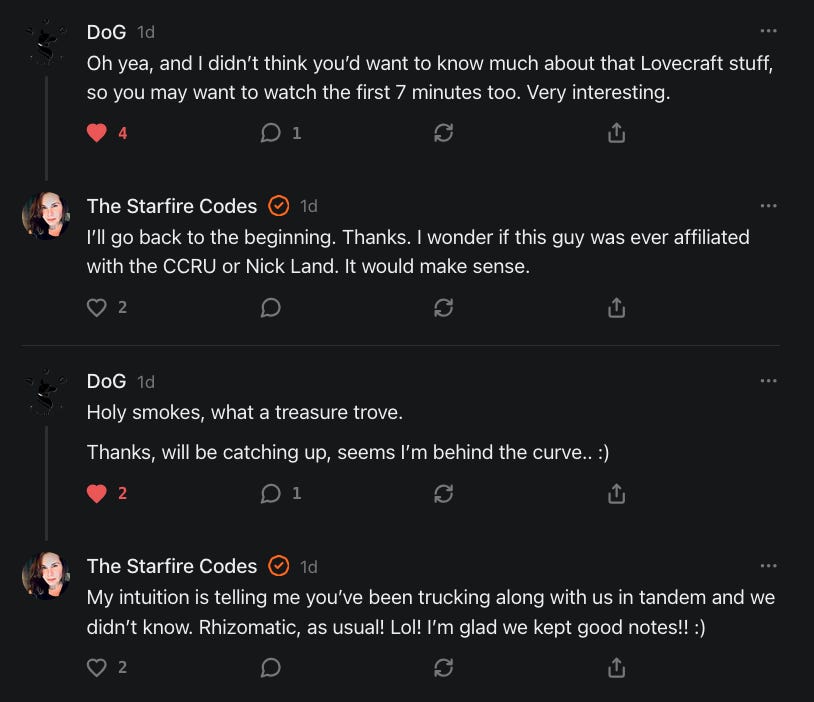 This is the same accelerationism push that Apollo's Lyre, Jessica J, and I have been looking into. He even mentions Lovecraft. Wow. Looking into the CCRU is what started us making all of these Cthulhu jokes more often…..