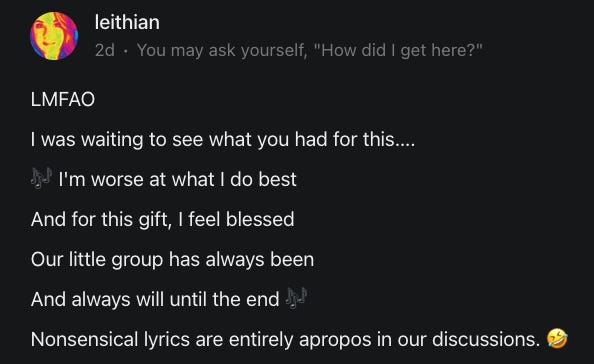 And we’re singing along and having fun with it… but we’re looking at each other like what in the actual Twilight Zone everloving monkey fuck is happening right now….