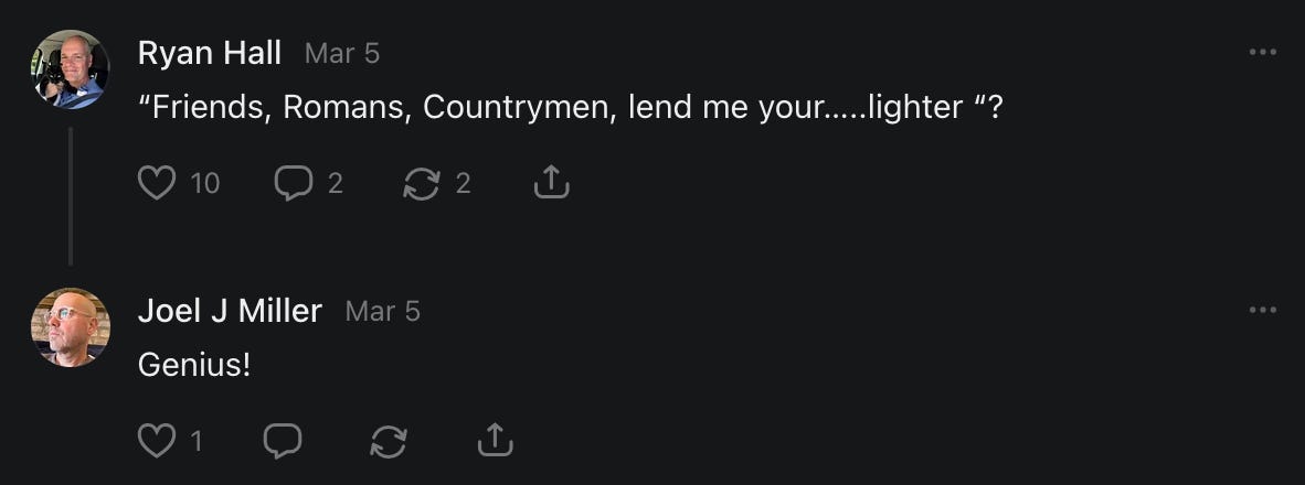 FRIENDS, ROMANS, AND COUNTRYMEN… LEND ME YOUR LIGHTER….