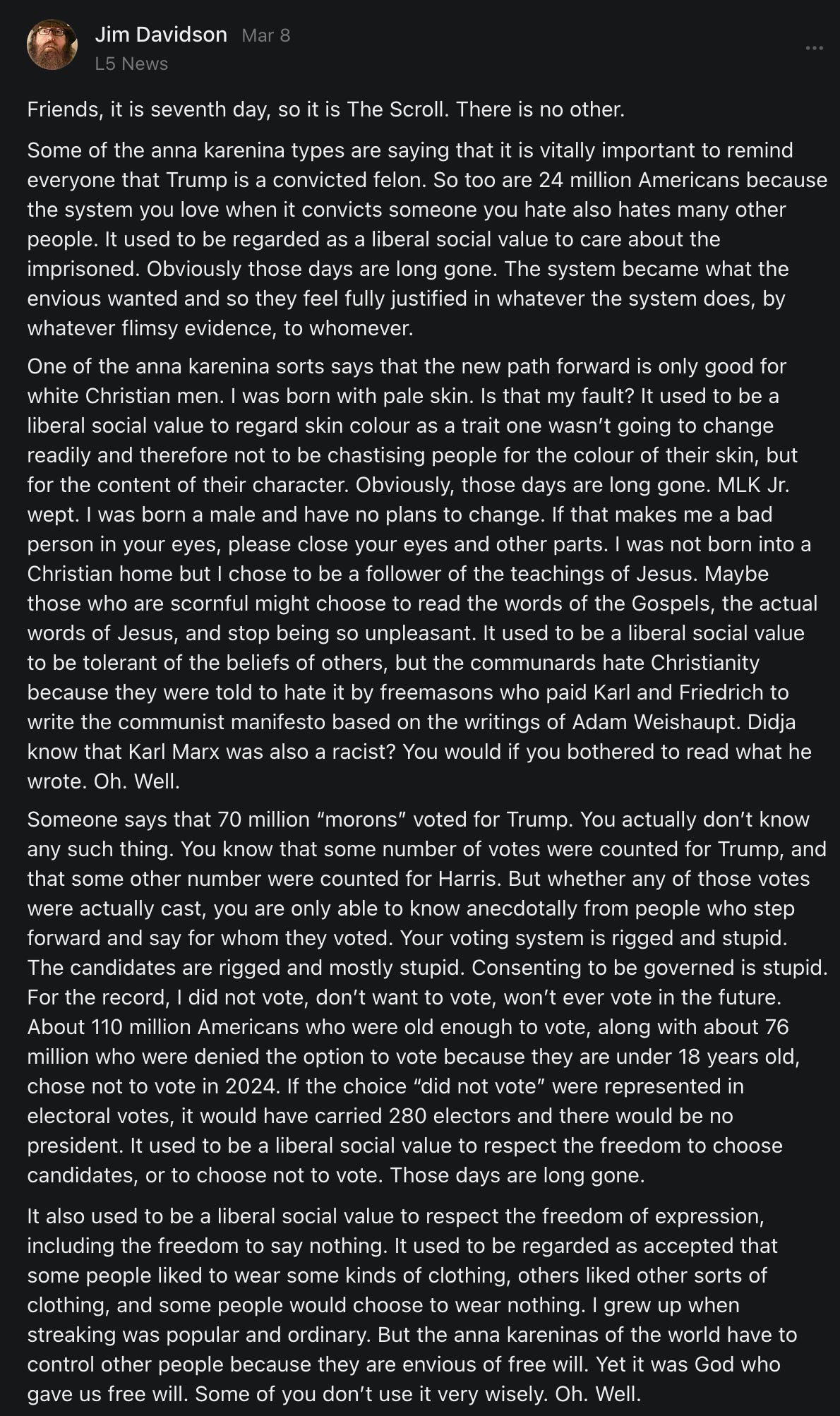 THE SCROLL is a weekly free-form multimedia stream of consciousness digest of interesting, informative, educational, and otherwise amusing posts and conversations from across Substack and amongst Substack writers and readers, carefully curated by the author.
