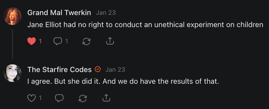 This study did more than make the children who were exposed to it “less prejudiced. It also taught important lessons to TPTB on how to weaponize arbitrary divisiveness. We are seeing this weaponized arbitrary divisiveness bubble up in Woke ideologies that are pushed from on high, and then self-perpetuate among those exposed to those ideas via virtue signaling and a robust social reward infrastructure bolstered by access to resources/approval or lack thereof.