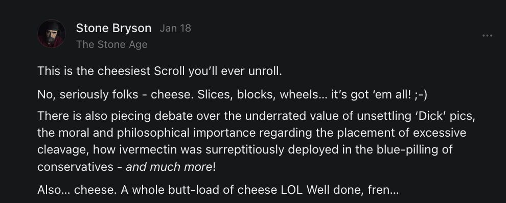 THE SCROLL is a free-form multimedia stream of consciousness digest of interesting, informative, educational, and otherwise amusing posts and conversations from across Substack and amongst Substack writers and readers, carefully curated by the author.