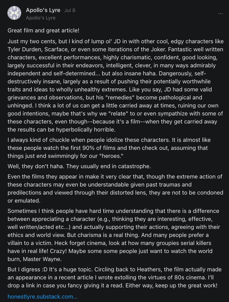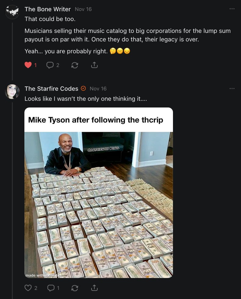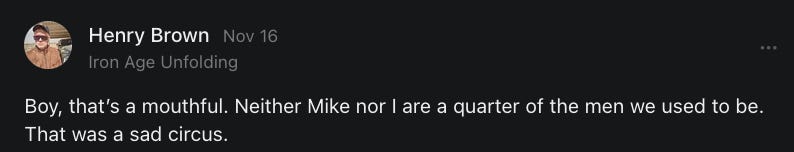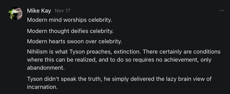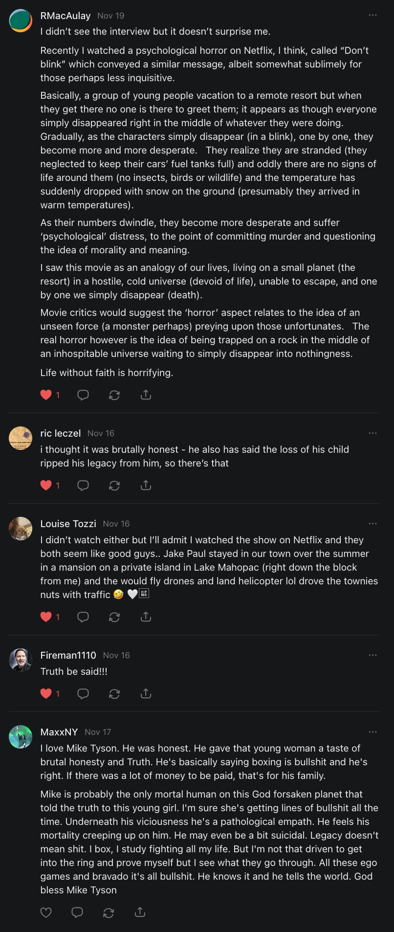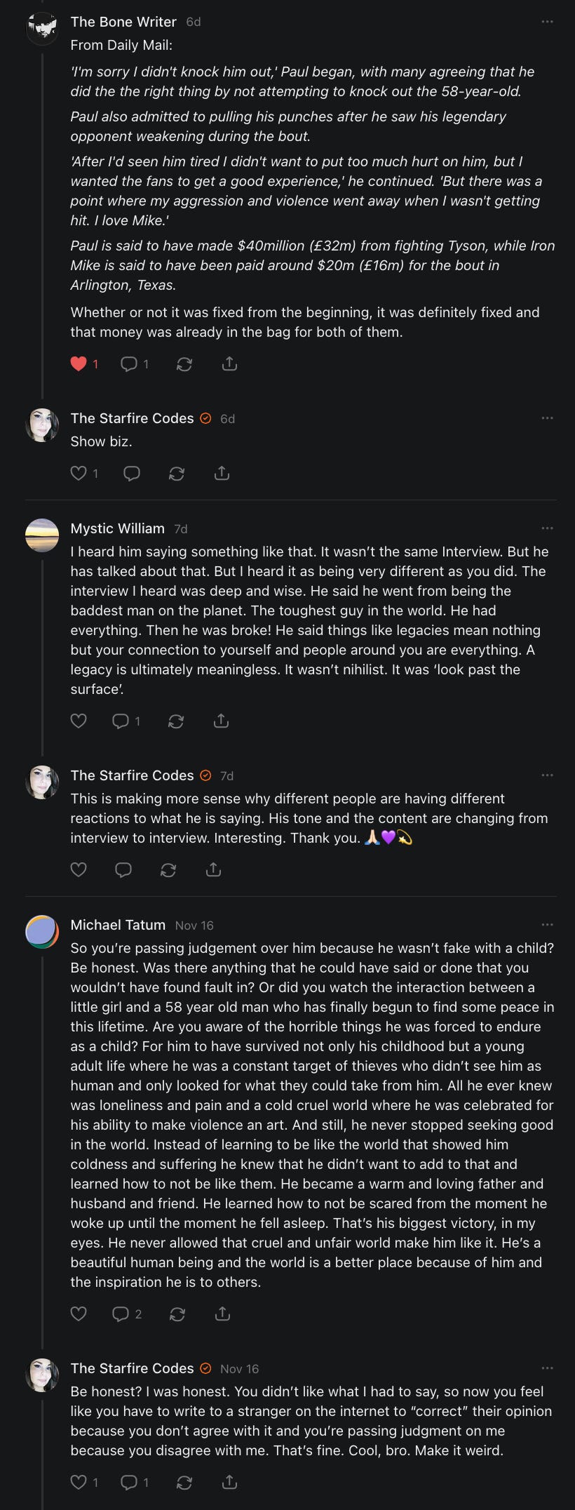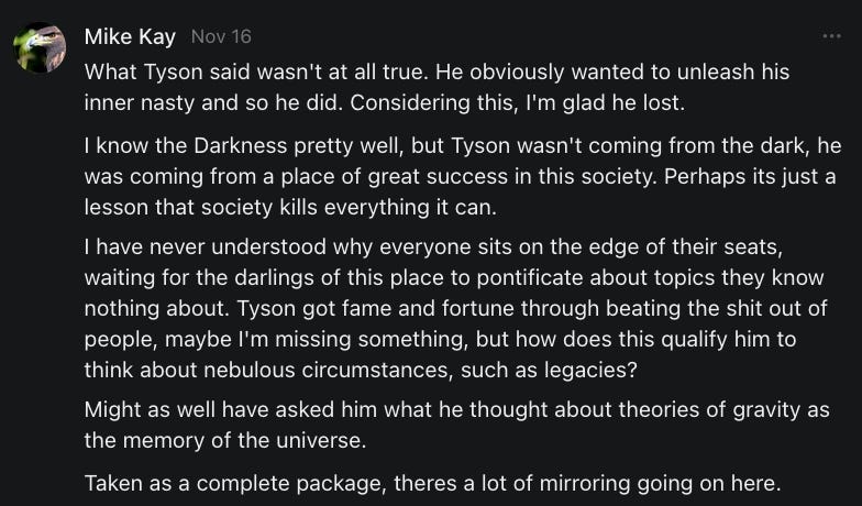“I think this is a very fair take. We know from interviews (like his discussion of Alexander and Ghengis Khan on Rogan) that Mike has always been very conscious of legacy, and is very well educated on great leaders throughout history and their legacies. So his comments could be a hedge: ‘If I were not Alexander, then I should wish to be Diogenes.’ However, I will posit it really could just be Mike being honest about his current reflections on life and legacy. Obviously in many ways Mike has been a horrible person, a tormented person, and because of that, his career path, his squeaky voice and vicious temper, he often gets dismissed as a meathead or moron, but I don't believe that to be true. He either lacks or doesn’t care to utilize the social filters that normies like the interviewer require to function. He is too real, too raw for ‘polite’ society, but I think in his case that is more a testament to his intellect and introspection than it is to some deficiency of those faculties. Not saying anyone intimated the latter haha, just spitballing here :D I actually find him really fascinating. Most people hide their horror, their monster, their shadow, or they collapse under the weight of its exposure. Mike is the rare man who has suffered hellish abuse and also perpetrated it, who has been drowned in shadow--his own and those who harmed him--had it all laid bare before a sneering world, and yet somehow found a way to come out the other side and unflinchingly recount the tale. Of what he was, is, and may yet be. He is a very complicated, fascinating, and rare person, especially in this age.” -