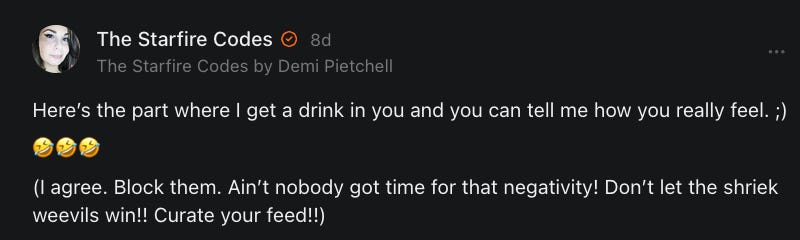 So I highly recommend curating your own experience - in life and on platforms - especially if you find certain people to be beyond irritating and experience no joy or benefit from engaging with that particular energy. There is no reason to lean into your own irritation when it is only going to beget additional irritation.