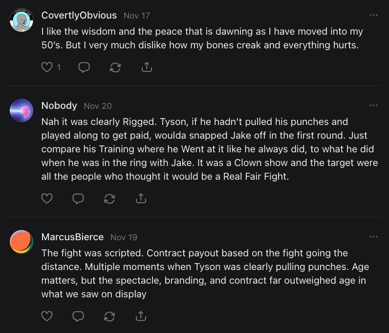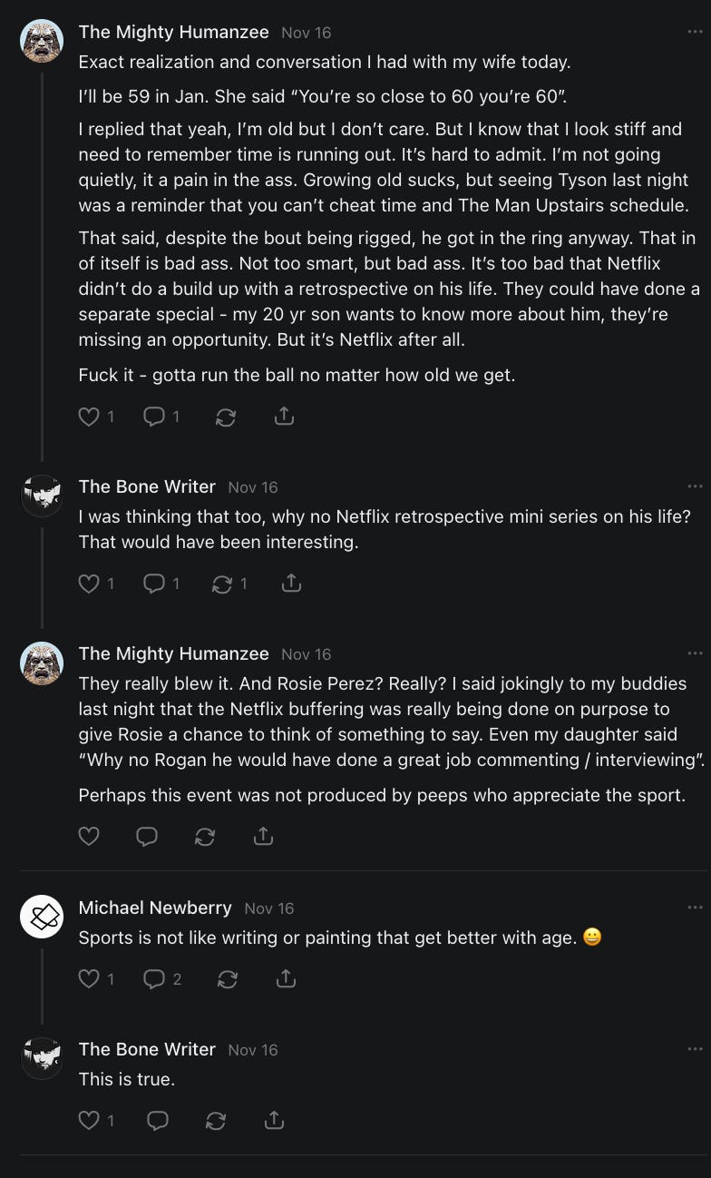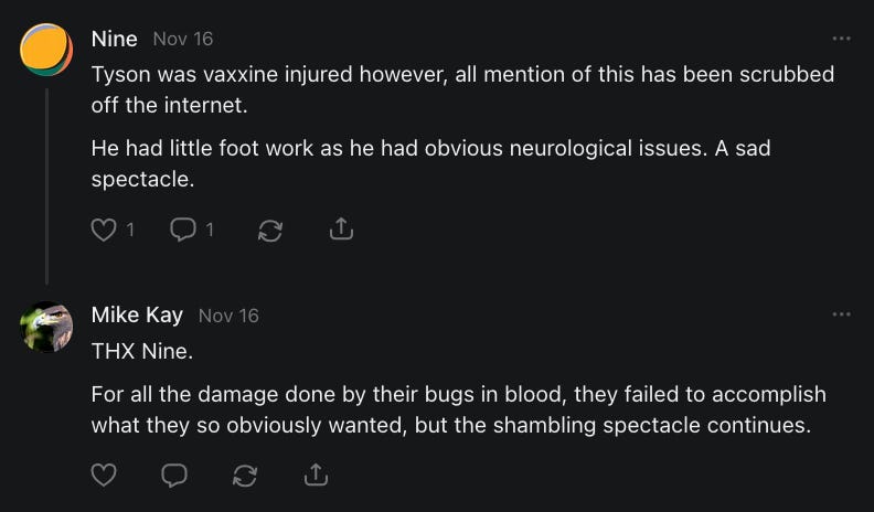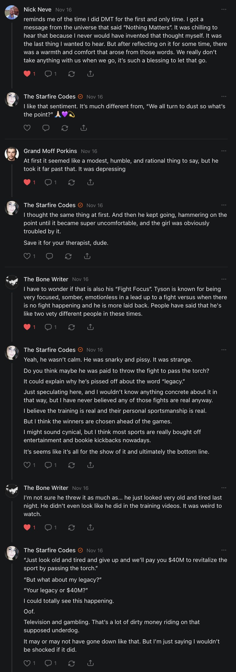 “Demi, I saw your post. I watched the fight. Tyson came out strong but not his prior fury. Just my opinion here… After he took the first 2 rounds he seemed to go into a defensive mode. I think he didn’t want to hit the mat. He did lose his footing a couple times .. he was close to falling. It certainly appeared to me that he definitely did not want get not knocked out, and just go the distance. Whether that motivation was legacy or money we may never know. I think it was legacy because getting knocked down or worse knocked out would be a stain. It appeared to me that he was protecting from that potential outcome. I believe his statement to that reporter was to dismiss that potential outcome in advance whether for himself or to the public, or both. Just my take on it…” -
