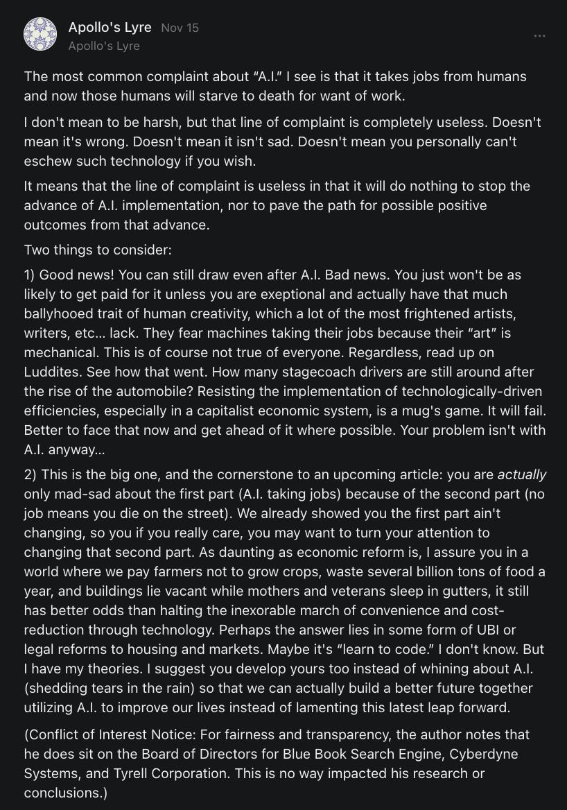 I like the idea that the world would be a better place if people were more like a fictional tunnel chicken and a fictional donkey depicted in prompt-derived artwork. This fulfils for a me a sense that in the future it will be possible to make great and beautiful works of art so fast that the Getty heiress won't be able to hire enough goofs to throw soup and paint and oil on all of them. Perhaps she will go bankrupt before she and her demon worshipping friends have destroyed everything in the name of a false sanctimony over a climate that was always changing anyway. More people still die every year from freezing cold than from too much heat, and the temperature trend is downward. But the grift is stronger with the "carbon capture" horse manure.
